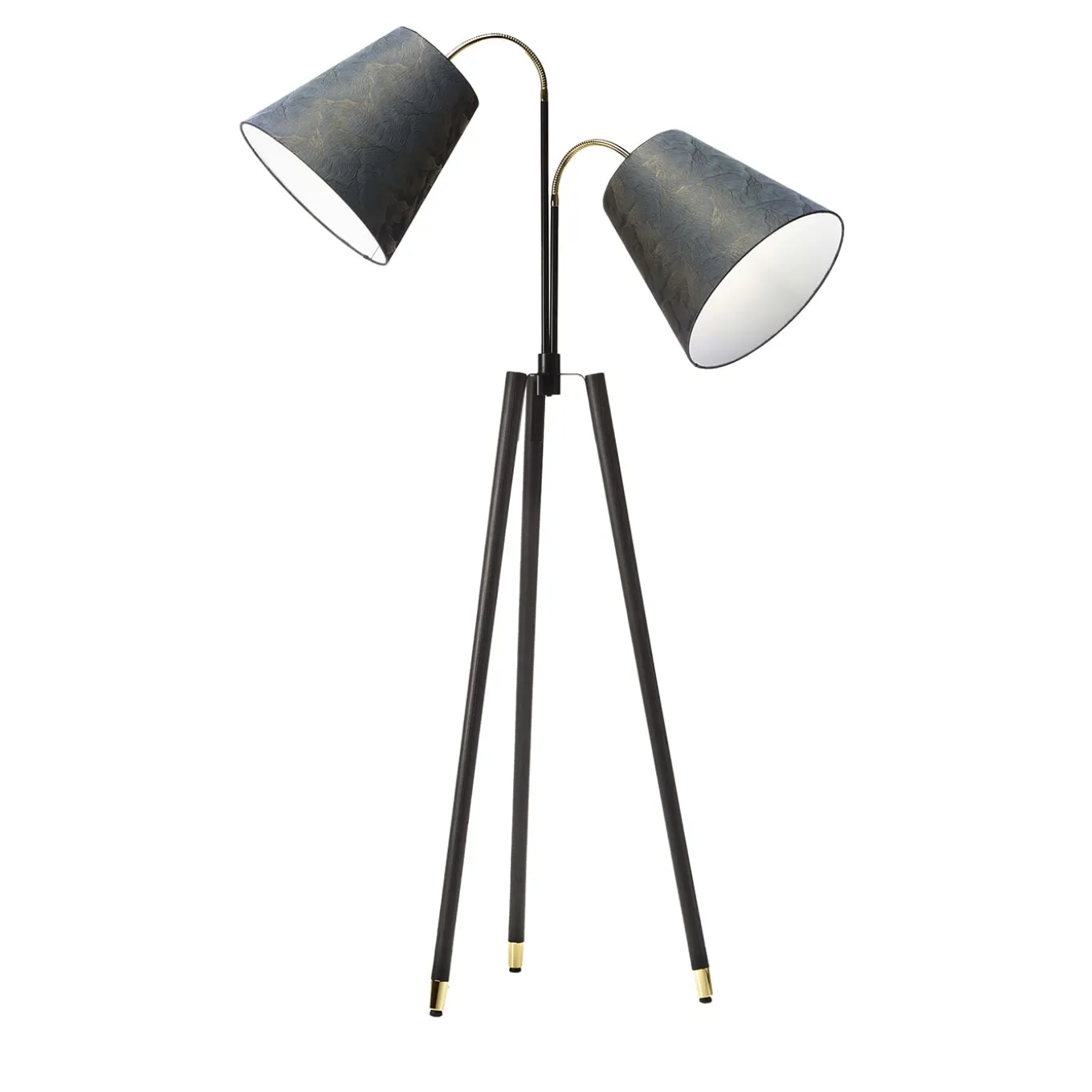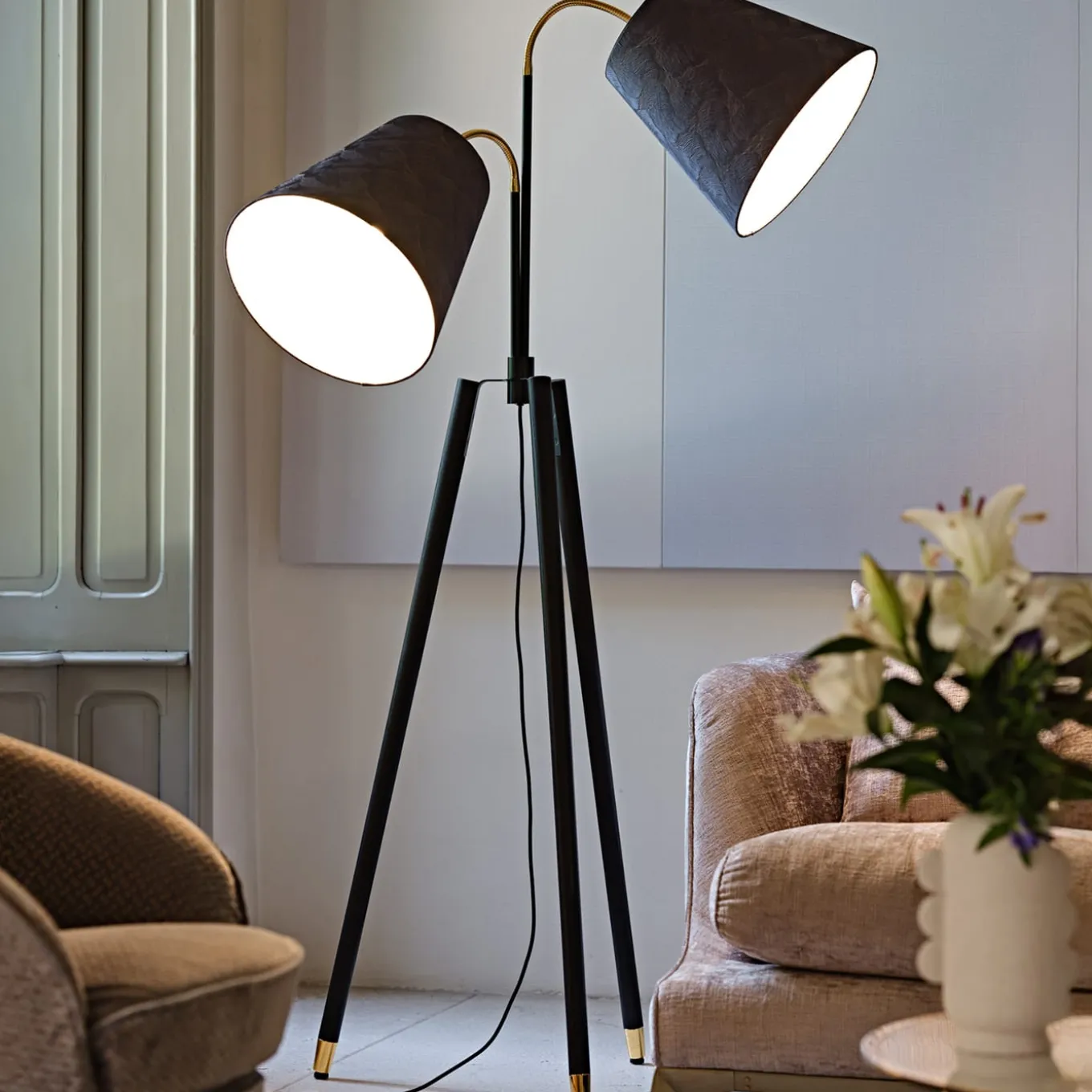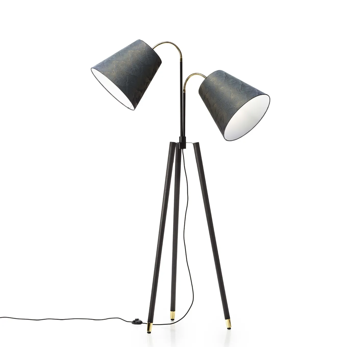 Designed with cinematographic lighting effects in mind, this stunning floor lamp boasts exclusivity in sartorial details and dynamic lines. Galvanic-finished golden tips brighten up the otherwise totally matte-black conical metal legs, which are gathered in a sleek tripod base. The glow emitted from a couple of refined fabric shades enhances the lamp’s appearance. It fits E27 bulbs (not included).