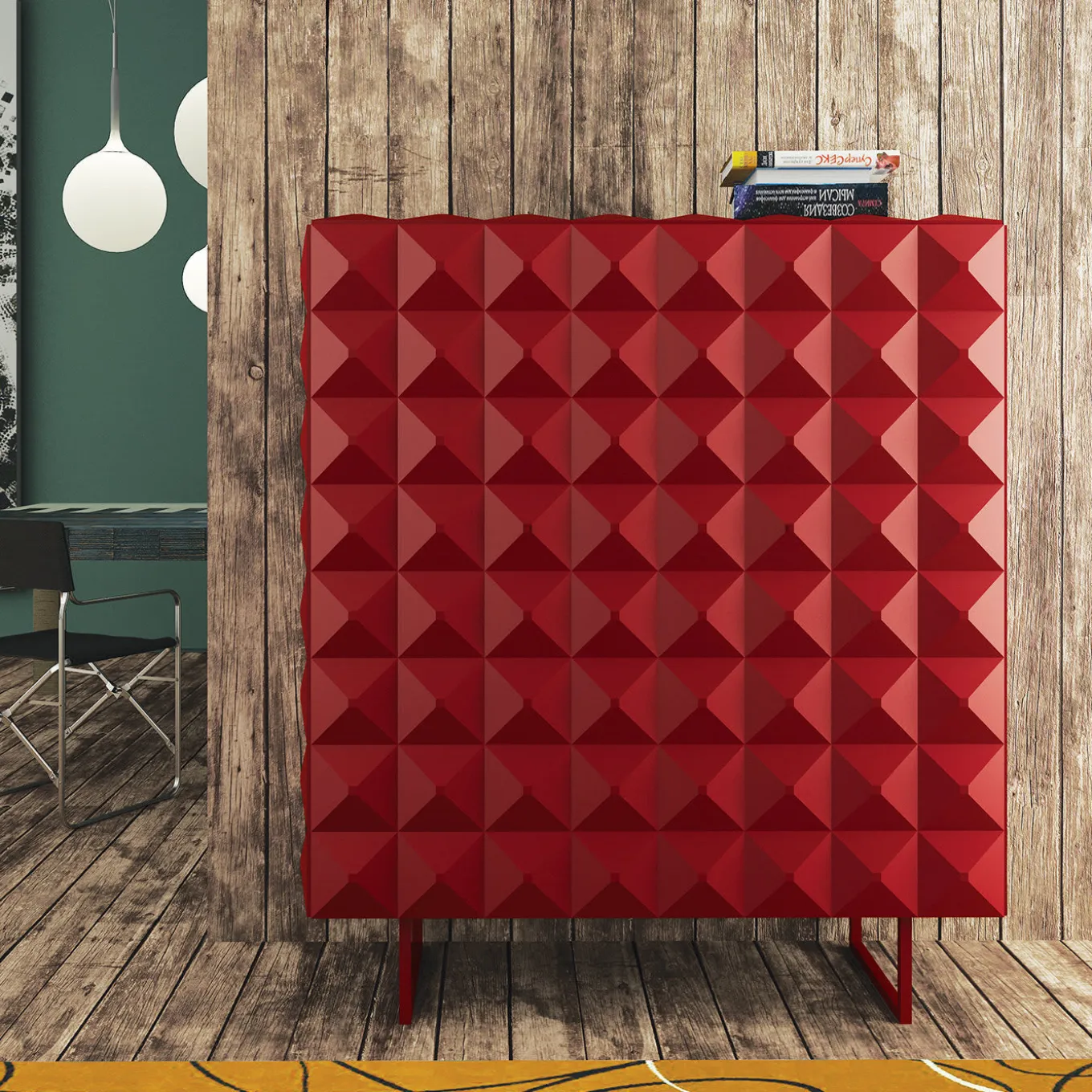 This one-of-a-kind red cabinet will become the protagonist of any room of the house. Made entirely of textured lacquered MDF, it is covered with 15×15 cm section pyramidal magnetic tiles and supported by a black lacquered metal base with a 25×25 cm section. Two hinged doors, a fixed central band with internal shelves and a knob opening complete the ensemble.