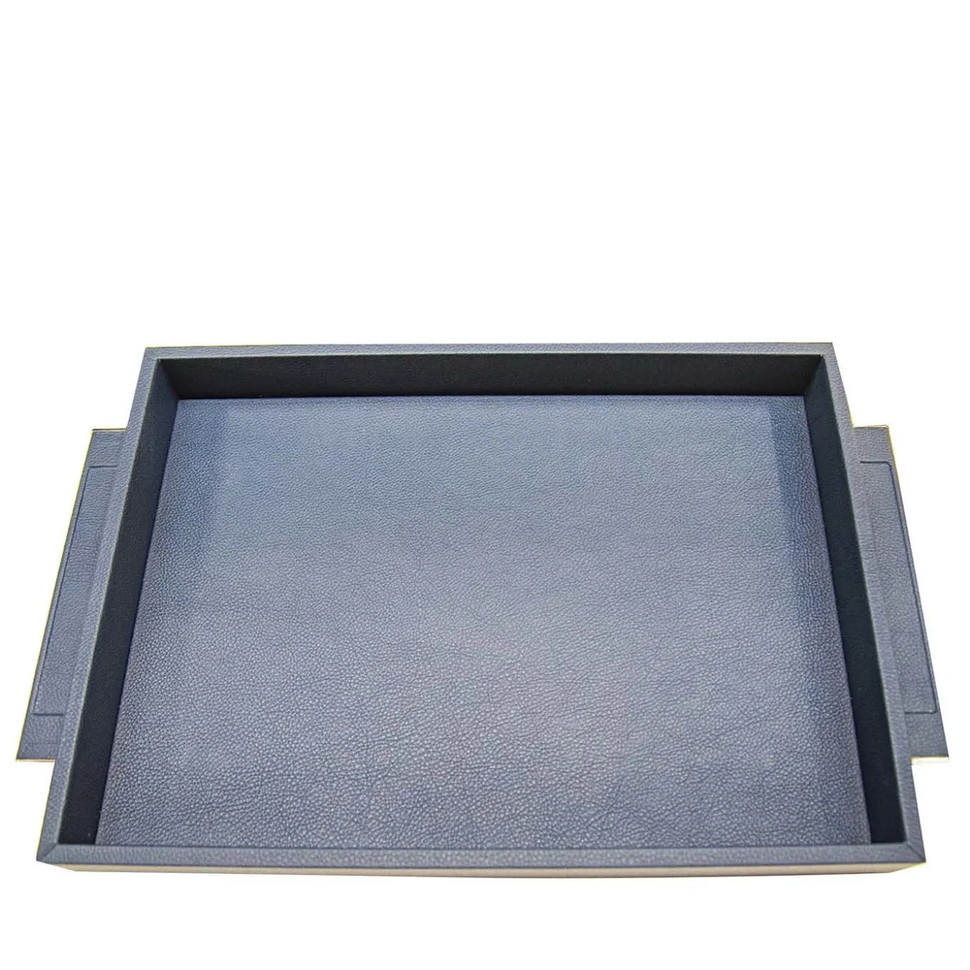 Classic design and high-quality materials combine in this sophisticated leather tray that boasts a wooden rectangular frame covered entirely in soft pebble leather in a timeless blue color. The rectangular handles are attached to the shorter sides and accented with chrome-finished metal, and the rim features a tall border all around. Whether to serve drinks, showcase small objects on a coffee table, collect important papers on an office desk, or display perfume bottles on a vanity in the bedroom, this tray will bring a sophisticated accent in any decor.