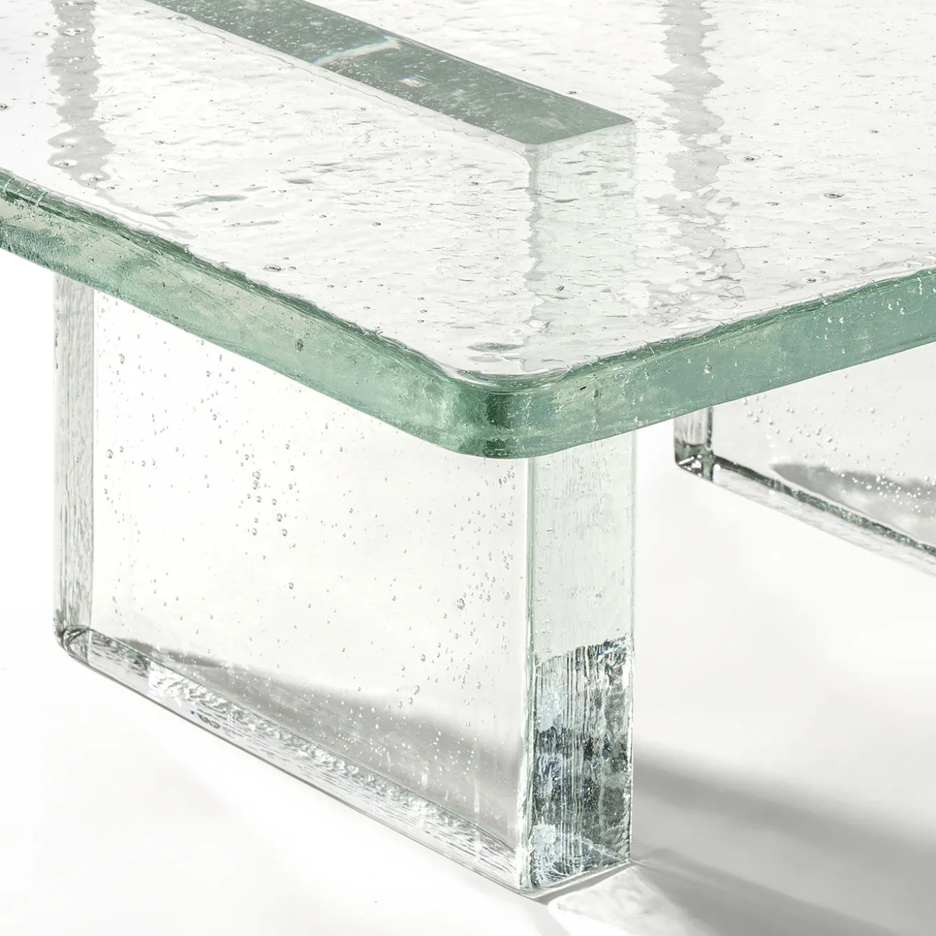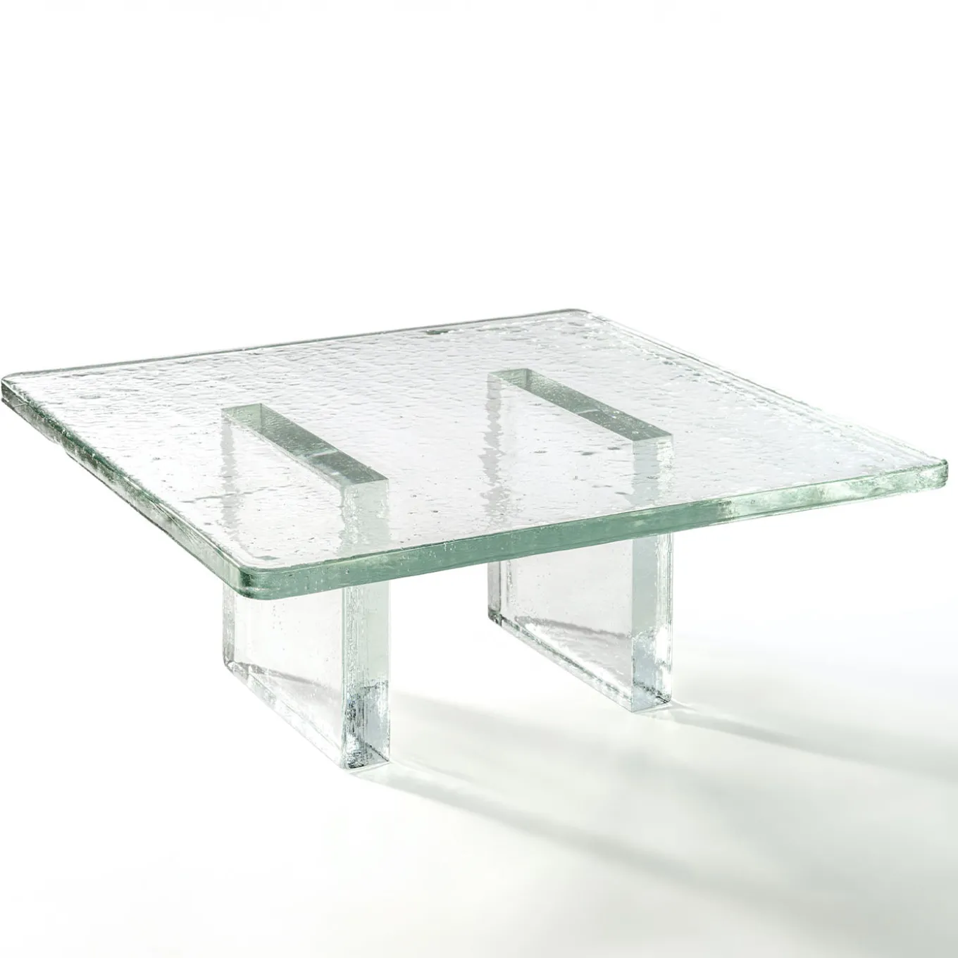 The Berg square glass coffee table by John Pawson features a distinctive design that emphasizes the material’s unique tactile and visual properties. Crafted from cast glass with a textured surface, this medium-size table explores the interplay between concrete form and abstract aesthetic. Its minimalist square top rests on two robust support bars, creating a balanced and striking silhouette ideal for contemporary interiors.