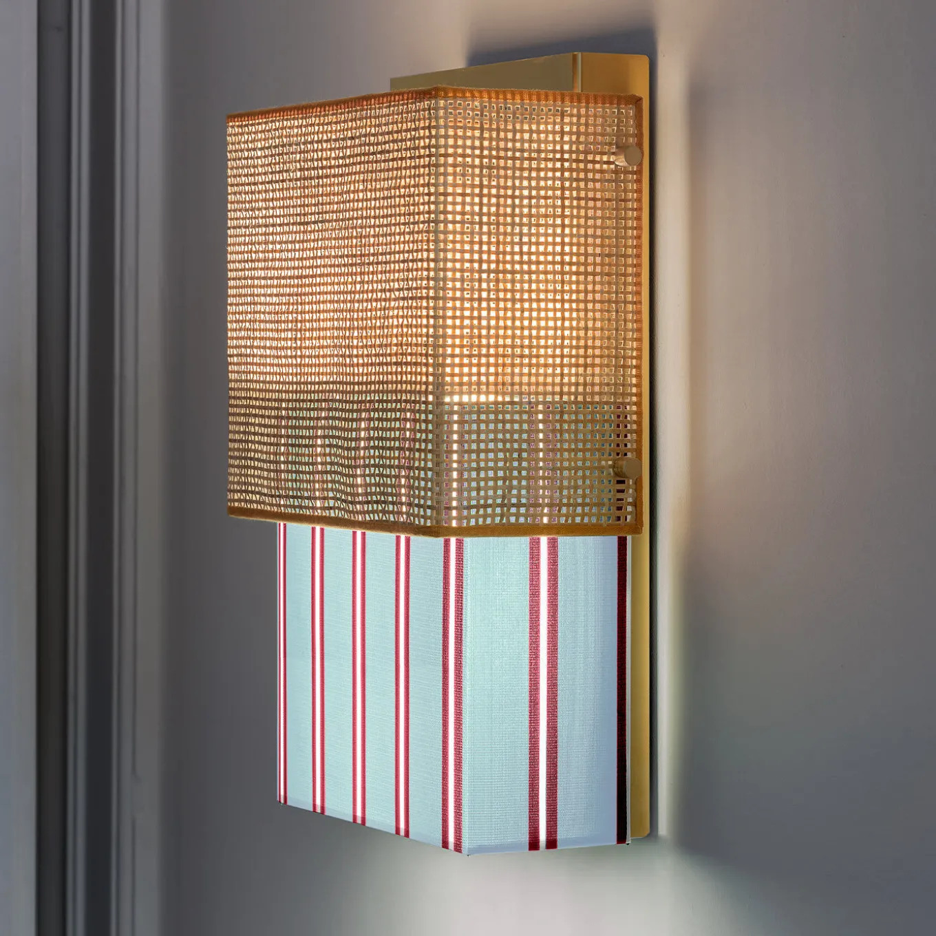 This elegant, whimsical wall lamp is made from a surprising combination of contrasting textures and textiles. A rough rattan surface sits above smooth Trevira fabric in light-blue, red and white stripes. This two-piece design was inspired by the iconic bikini swimsuit. A lustrous, gold-plated structure diffuses and reflects the light.