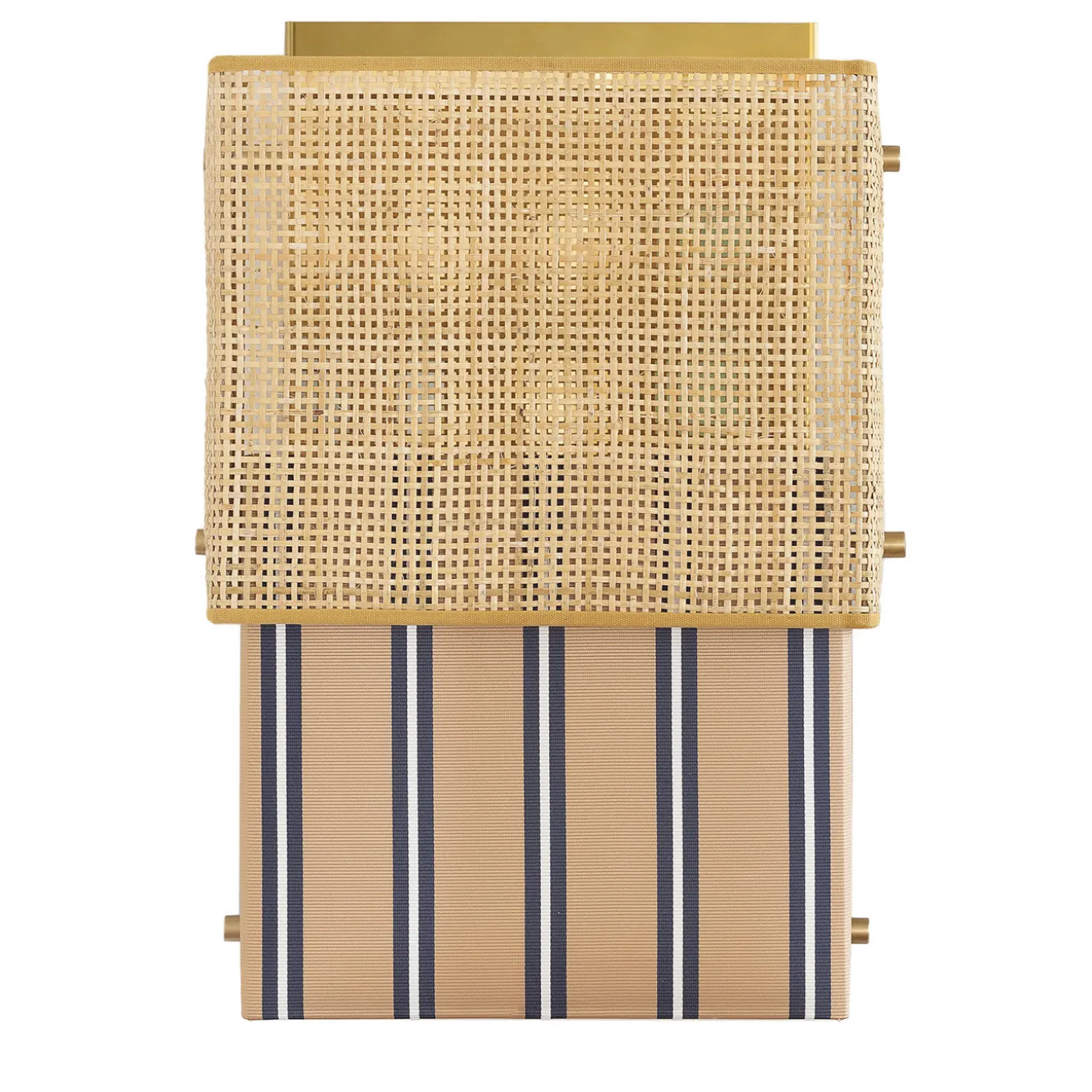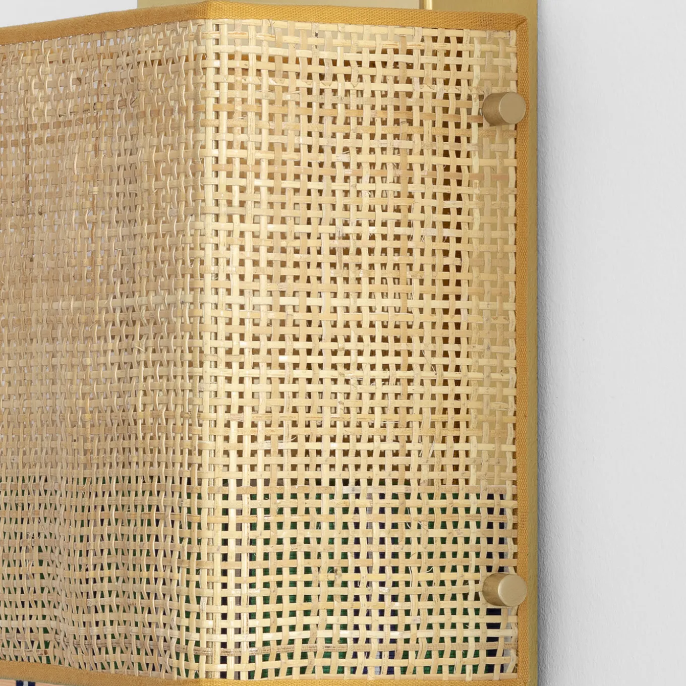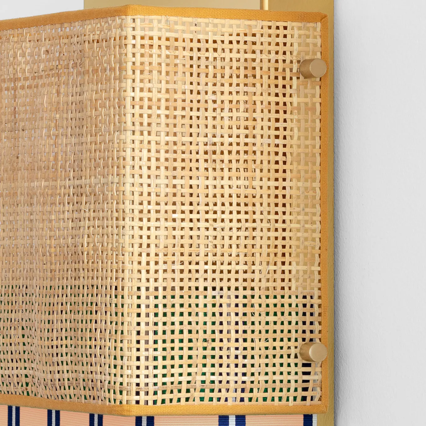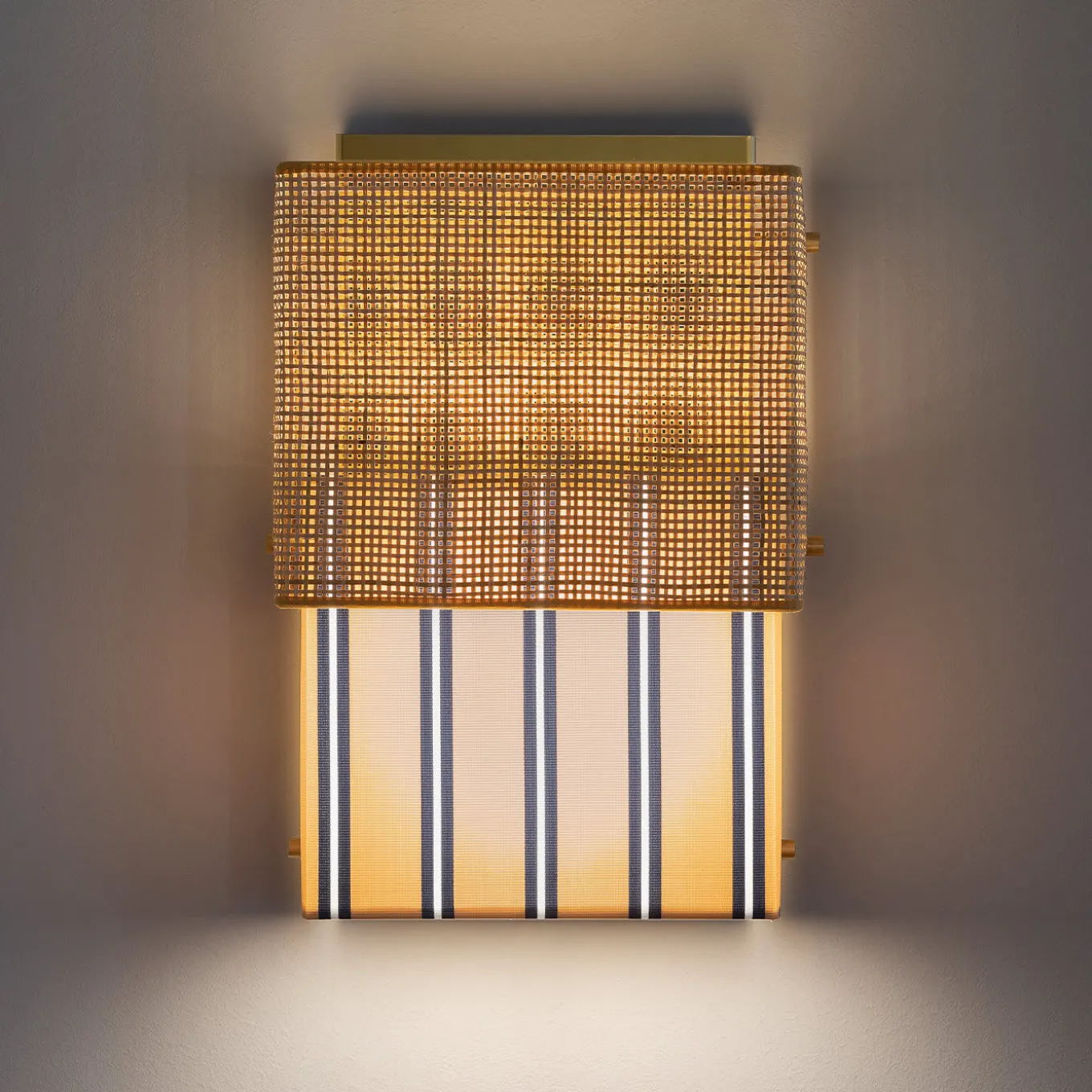 This wall lamp features the earthy, warm shades of terracotta and natural rattan. Its two-piece style is inspired by the bikini, one of the most iconic designs of the 20th century. Its gold-plated, stainless-structure is highly reflecting, diffusing the light. The Italian-based design company, Servomuto, is famous for translating vintage forms into modern lighting, and this item is no exception.