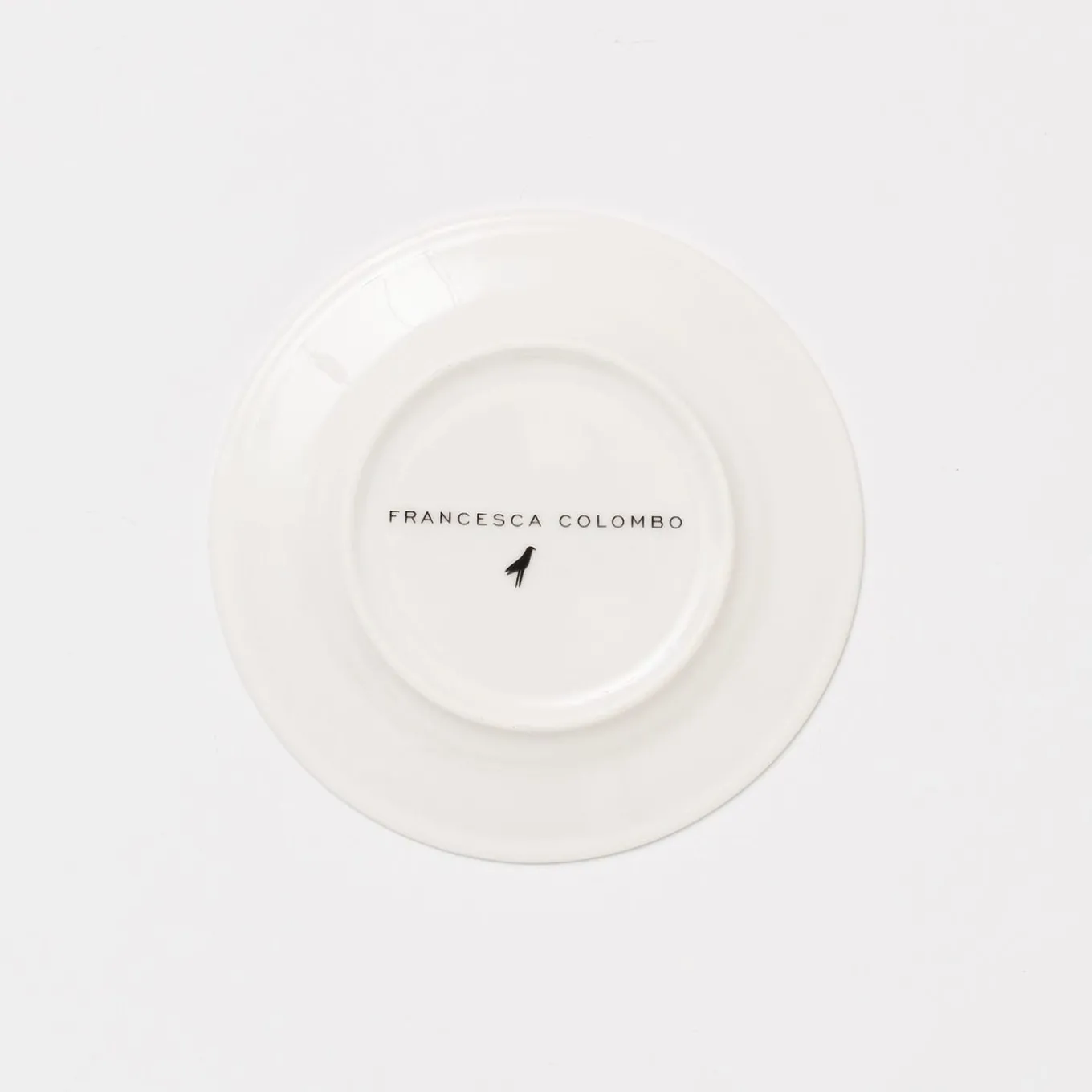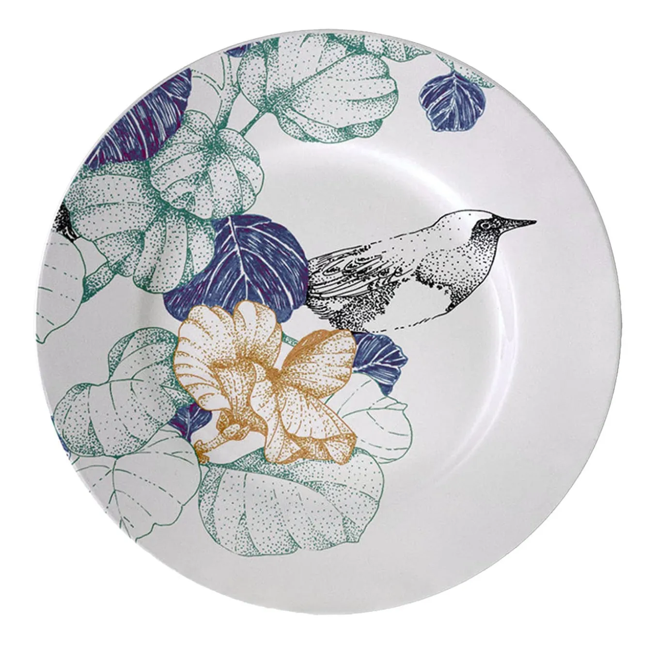 A poetic glimpse of a bird trying to hide in the midst of foliage is impressed on this set of bread plates composing this fine porcelain set. Both oven- and dishwasher-safe, the plates flaunt a sophisticated chromatic palette where green, terracotta, and blue shades enhance the decoration’s minute details initially obtained with the pointillism technique. A set of coordinated napkins are also available.