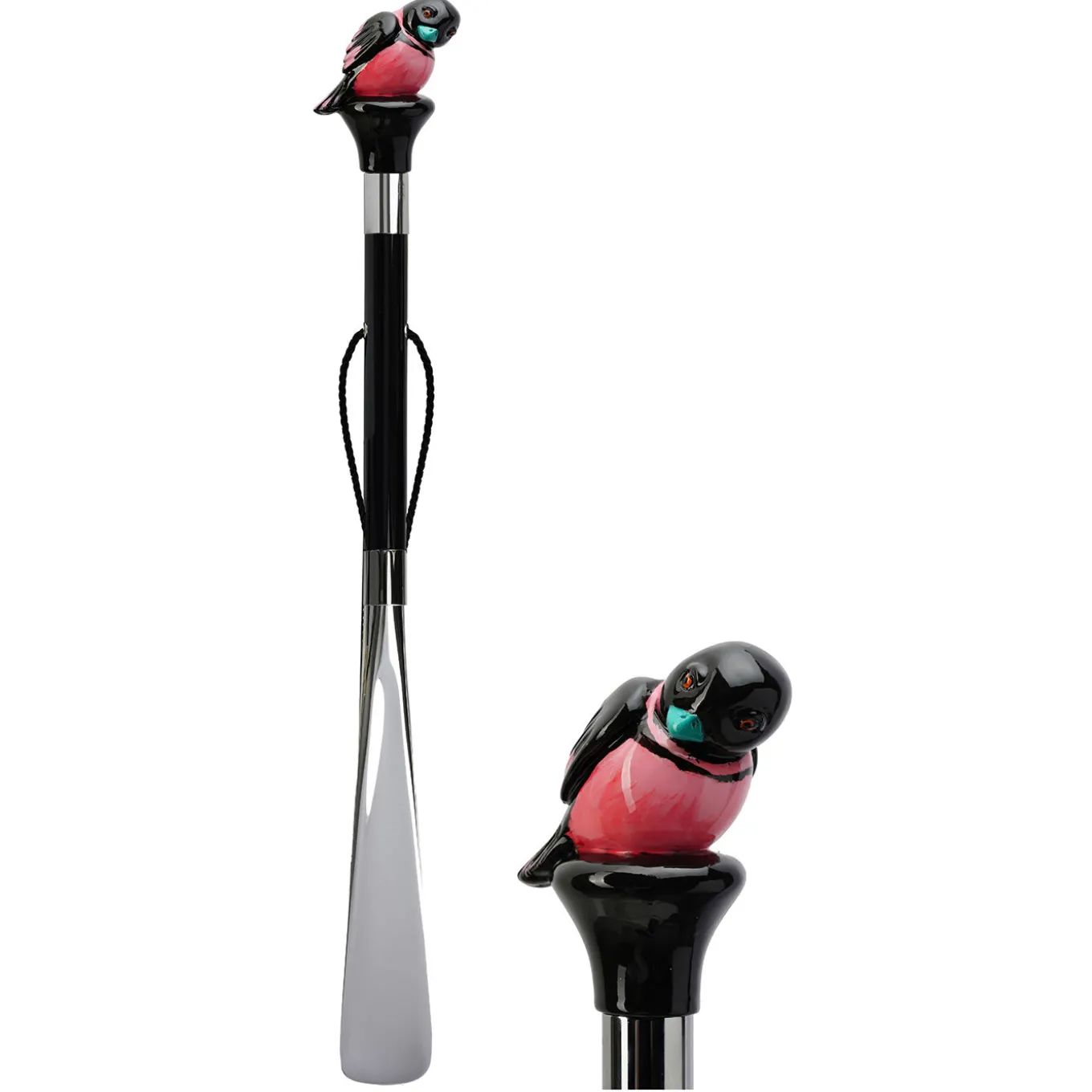 A tender sparrow hand-painted in black and pink creates the ornamental focus making this handcrafted shoehorn truly unique. Equipped with a practical loop for easy hanging and coming with a branded case, the piece features a smooth, silvery paddle in ABS held in place together with the glossy, black-lacquered beech shaft by means of a couple of silver-finished brass rings.