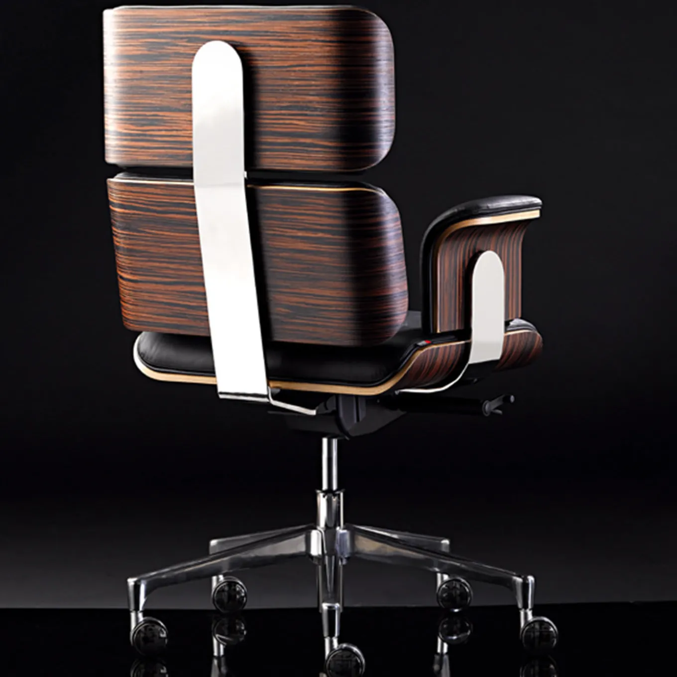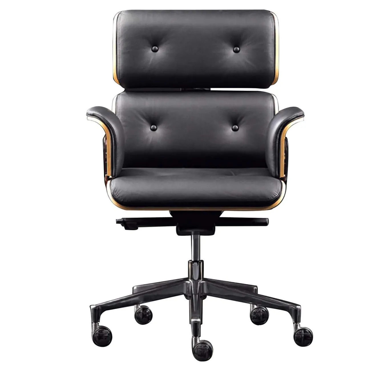 This swivel armchair has a five-spoked, cast-aluminum base. It can be locked into five tilt positions and seat height is altered via a pneumatic mechanism. Tilt tension can be adjusted to the user’s weight. Made in genuine, black leather with an ebony-finished, beech-wood shell and chromed-steel structure for the back- and armrests. Available in other leather colors and wood finishes.