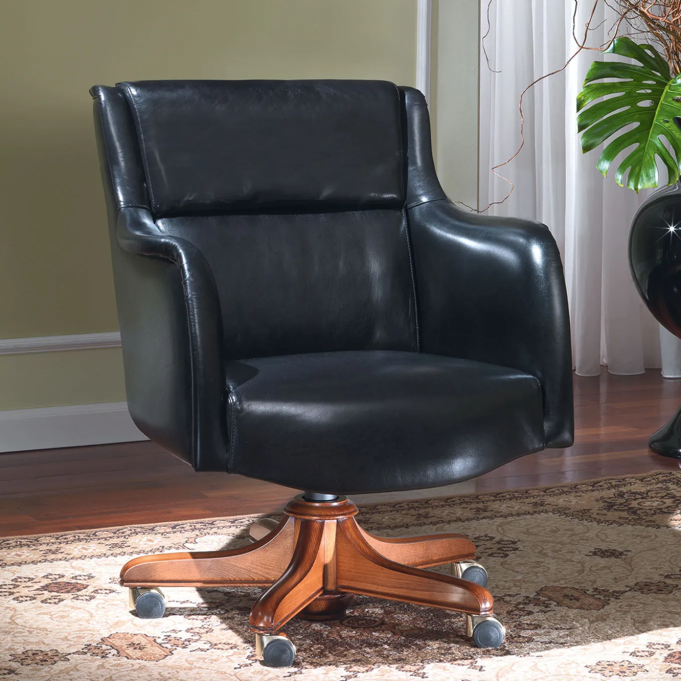 Luxury Classic style swivel armchair with beech wood structure. The seat height is adjustable and the swing mechanism helps to maintain a full range of motion, balancing the posture. It is padded with webbing and superior quality foam. The upholstery particularly enhances the luxuriousness of this model and underlines the enveloping design: the leather made with a tanned bull hide reflects a reserved elegance. Other leather colours are available, please contact our Concierge.