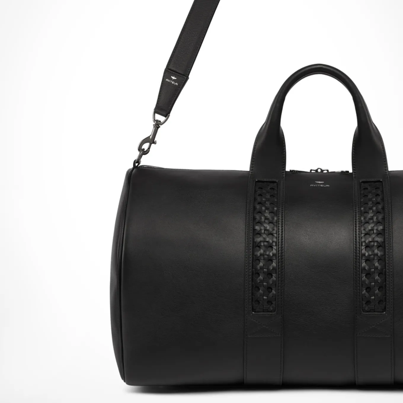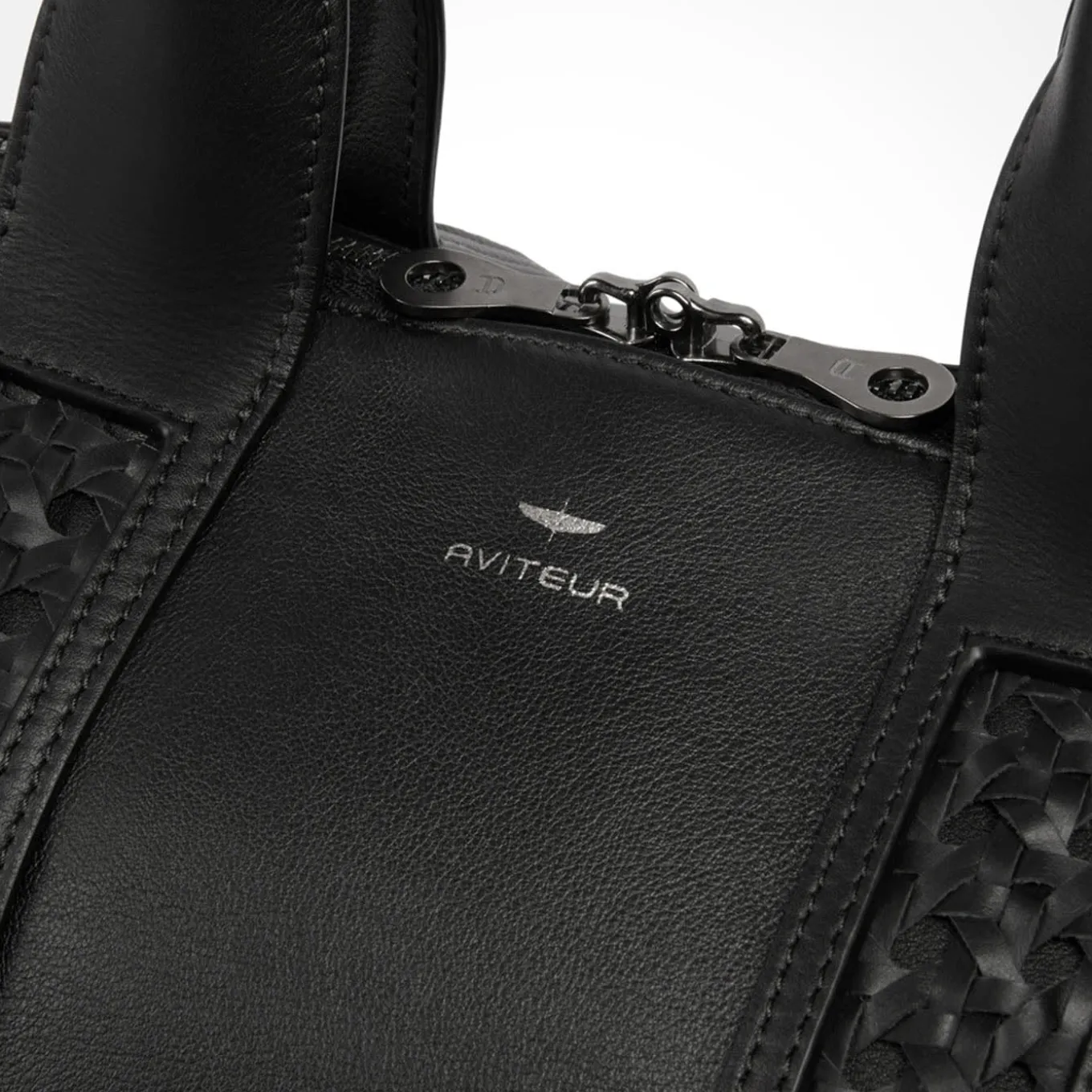 Duffle in black calfskin with leather weave and durable palladium hardware. Designed for both style and function, it comes with a leather shoulder strap and a suede-like washable microfibre lining. The interior includes a zipped compartment.