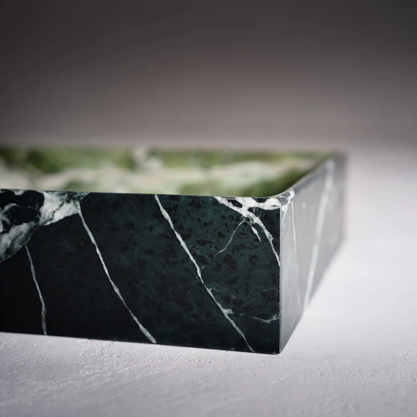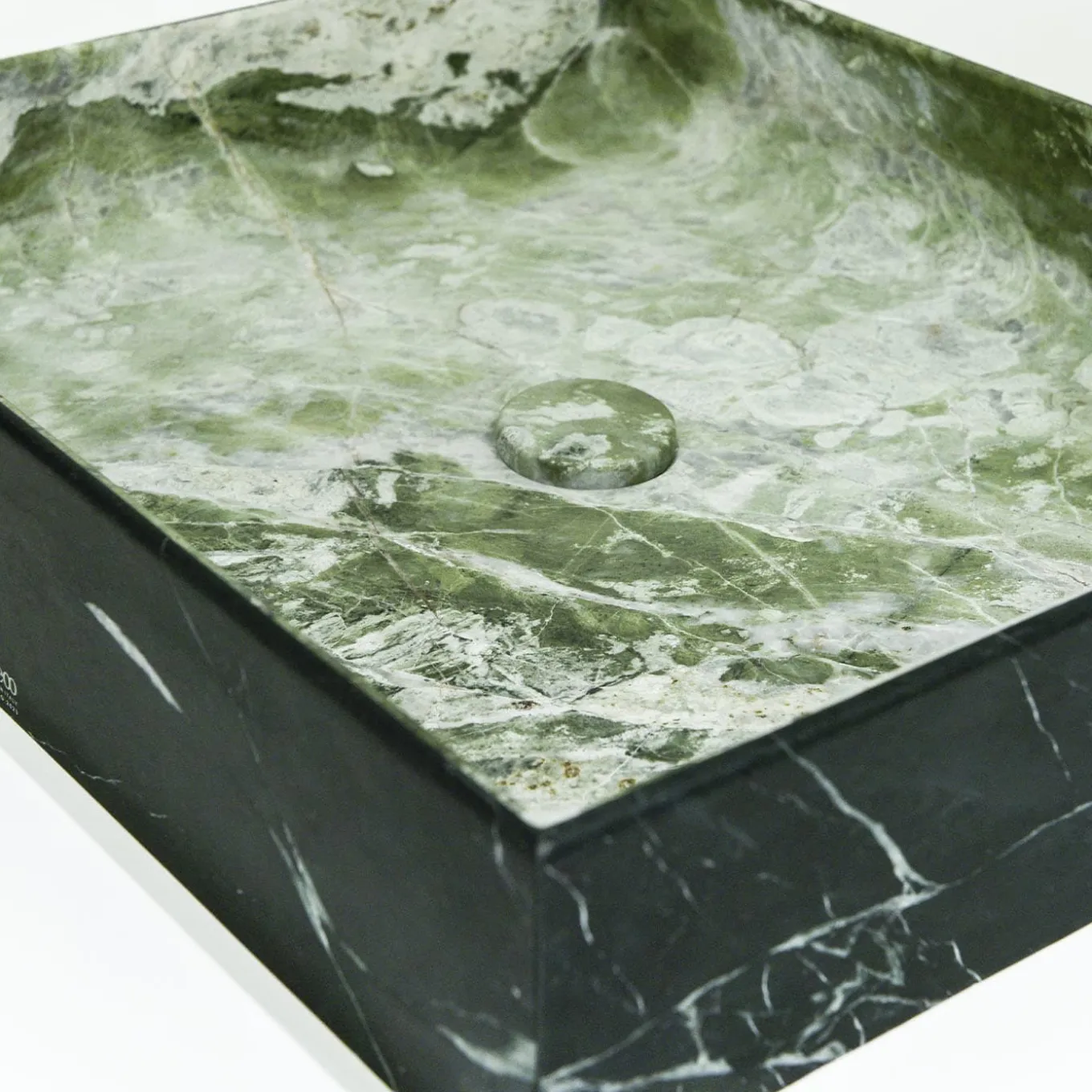 Testament to unique research of color, this square washbasin belongs to the Blessed Collection designed by Christophe Pillet, characterized by mesmerizing polychrome veinings merging in the combination of contrasting marble stones. Bespoke and masterfully finished, the two marbles meet on the upper border, finely worked by hand in a thin profile. Available in other versions on the Artemest catalog, please consult the Concierge for further information.
