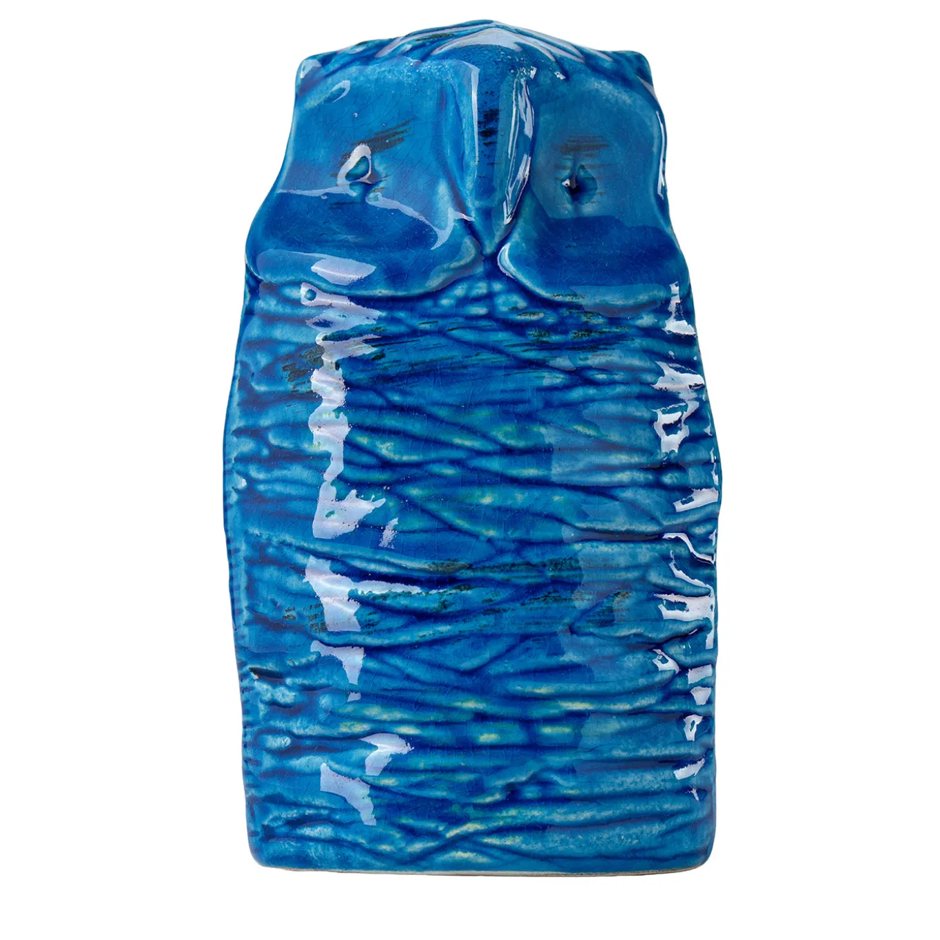 A refined owl figurine from the Rimini Blu collection, shaped in refractory white clay with a pressed form. The surface is decorated with distinctive manually incised patterns using stamps, all beneath a vibrant glossy blue glaze that highlights the intricate textures and depth of the design. This ceramic piece combines artistic engraving with a brilliant crystalline finish to create a striking decorative accent.