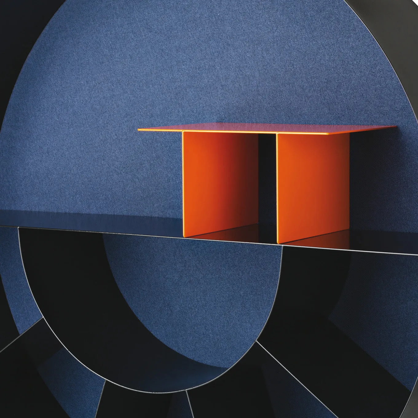 This unique steel sculpture, doubling as a bookcase, features striking shapes enhancing any space in which it is placed. The straight triangular steel base is softened by the curves of the circular element on top creating a dynamic look. The interior of the top element is completed with a series of shelves against the bright blue back drop of the piece that perfectly balance the dark color of the steel. A red center shelf adds a pop of color. This piece will fit perfectly in any room in the home.