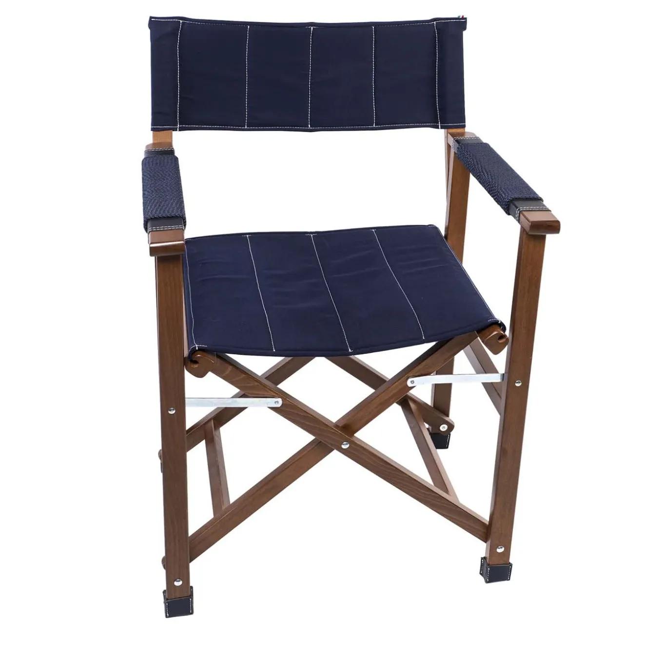 Iconic and timeless, this is comfortable chair is especially suitable for the boat and the pool, thanks to the high-quality, water repellent, and washable blue fabric that graces the seat and back, and the protective ferules that prevent water damage and slipping. The sturdy wooden construction folds easily for storage and features blue leather and rope inserts on the armrests. This outstanding chair will bring stylish allure to any indoor and outdoor space.