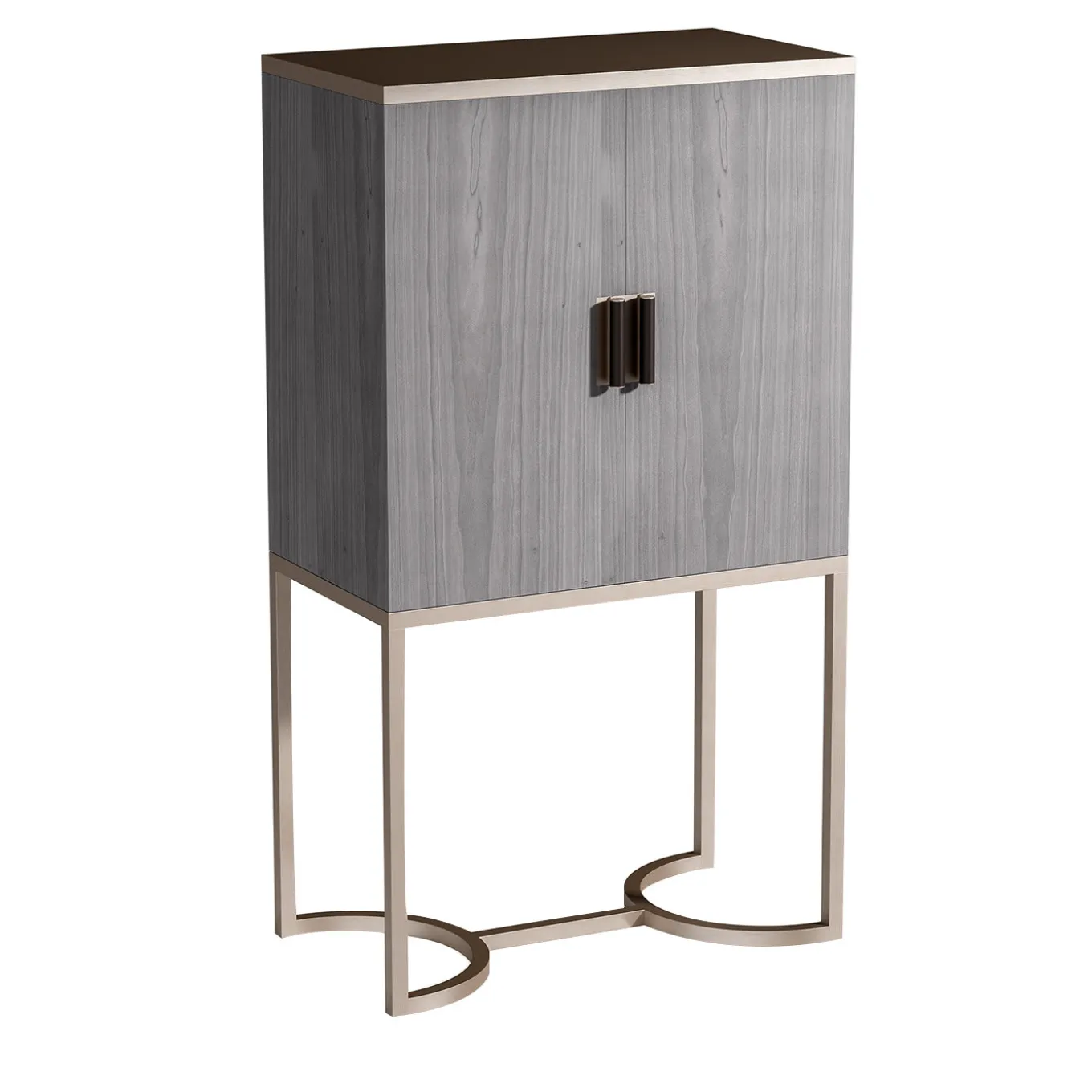 A classic design with a modern touch, this sophisticated bar cabinet is characterized by a sleek silhouette and bold architectural metal legs with two semicircles connected by a central bar. The square gray veneered wood cabinet has two doors with gray metal handles that open to reveal a well-organized space with shelving and storage and a mirrored back. The perfect place to store exceptional wines and liqueurs, this will be a well-received gift for wine connoisseurs and event hosts alike.