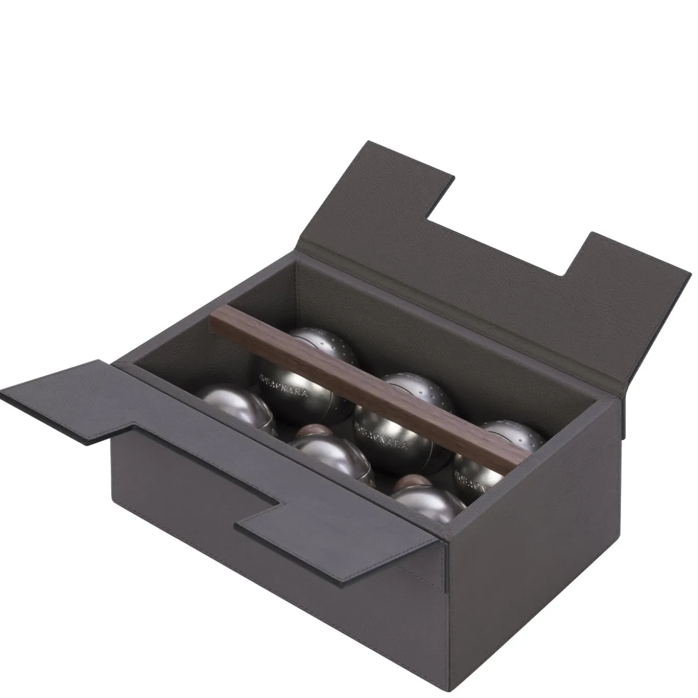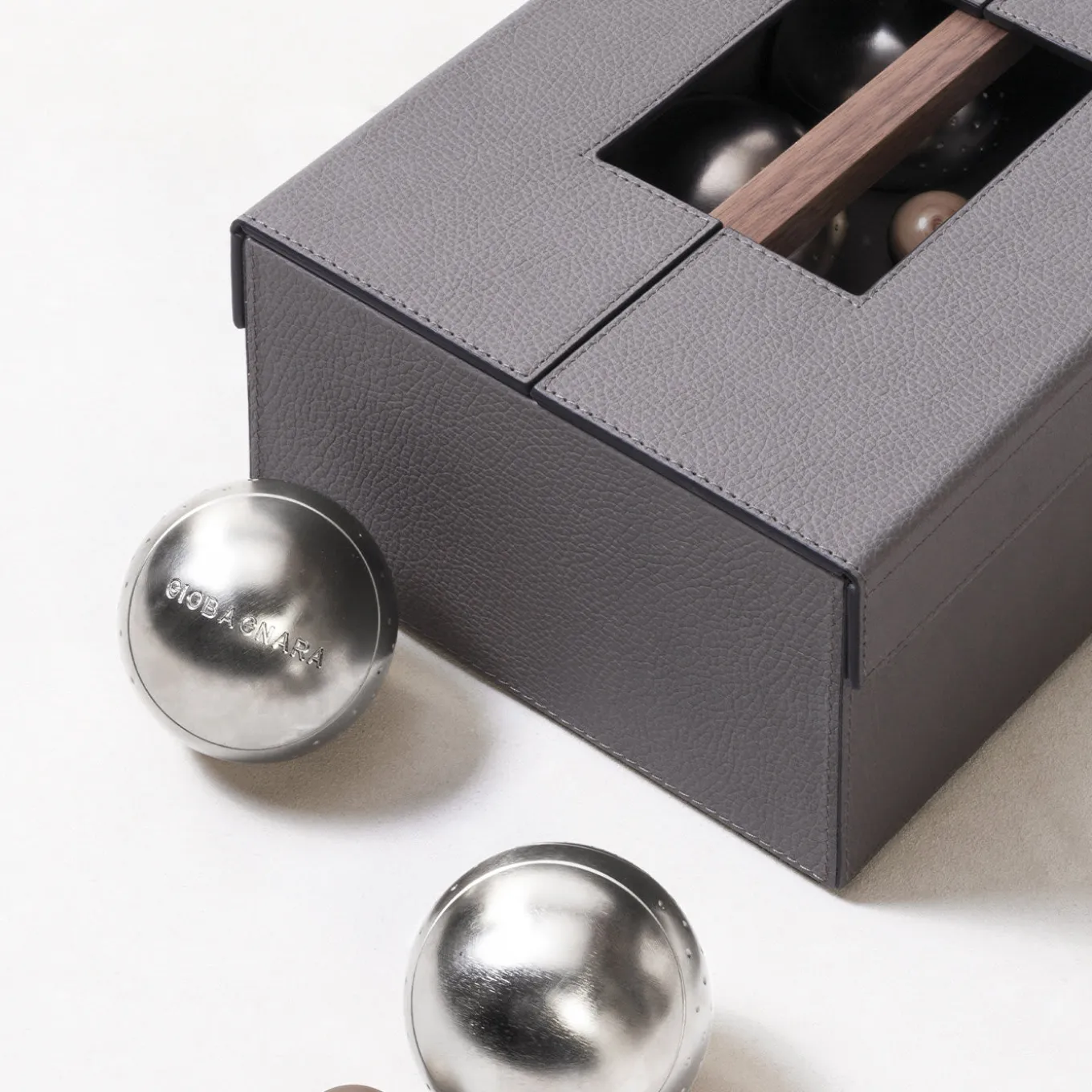 Composed of six heavy stainless steel balls and two wooden jacks that serve as target balls, this exquisite bocce set comes in an elegant and original gray leather-covered wood box embellished with a solid walnut wood handle. This popular Mediterranean pastime makes the perfect gift to celebrate a new home and will be a most welcome addition to summer weekend getaways with friends. Customization in other colors is available upon request.