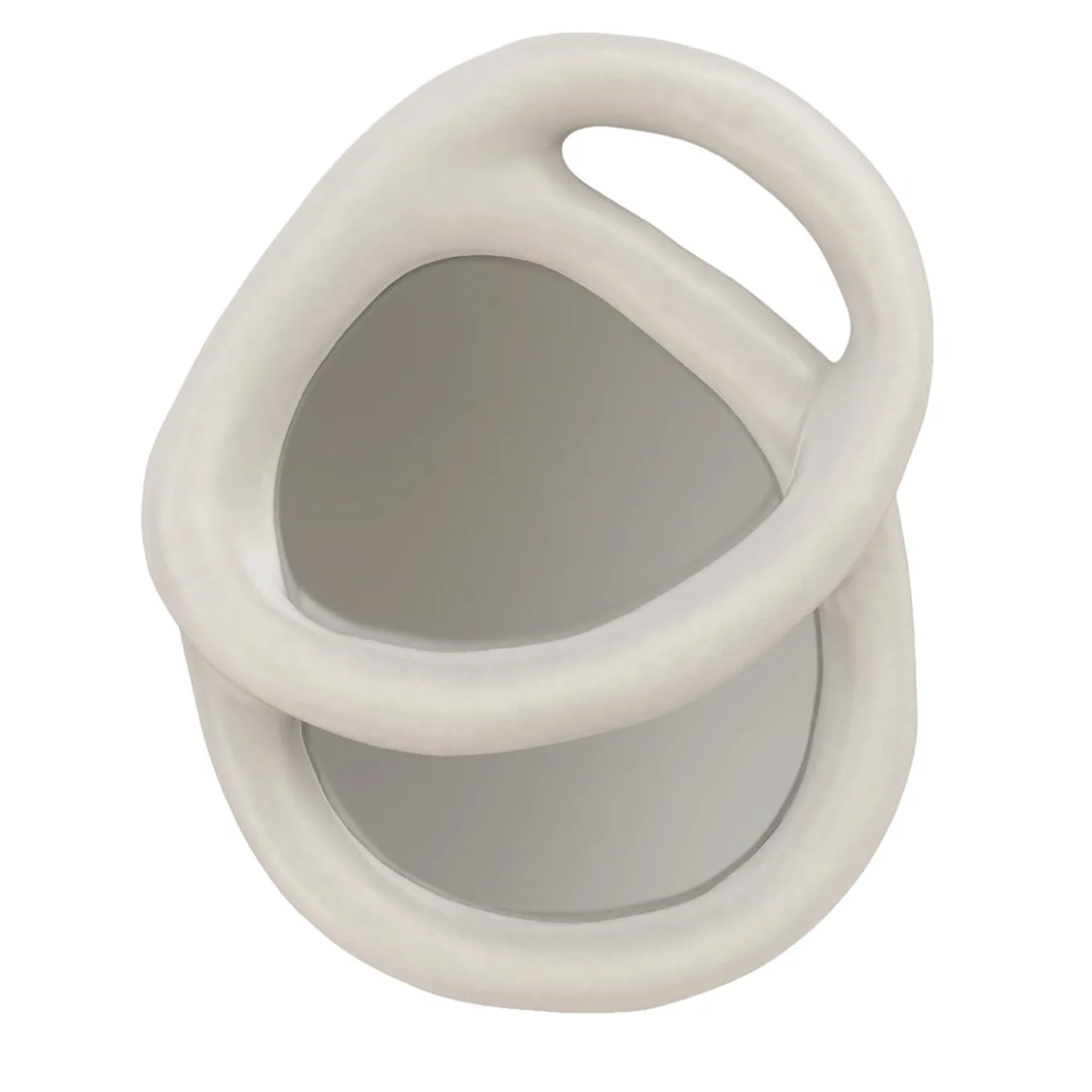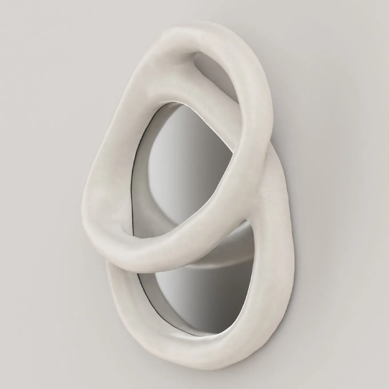 Large wall mirror with a dynamic three-dimensional frame that creates a sculptural effect when mounted. The frame features an embracing ring that overlaps itself as it extends from the wall, giving an organic and fluid appearance. Finished with multiple layers of putty and textured by hand, the surface offers an irregular, tactile quality that enhances its artistic presence. Designed to be both functional and decorative.
