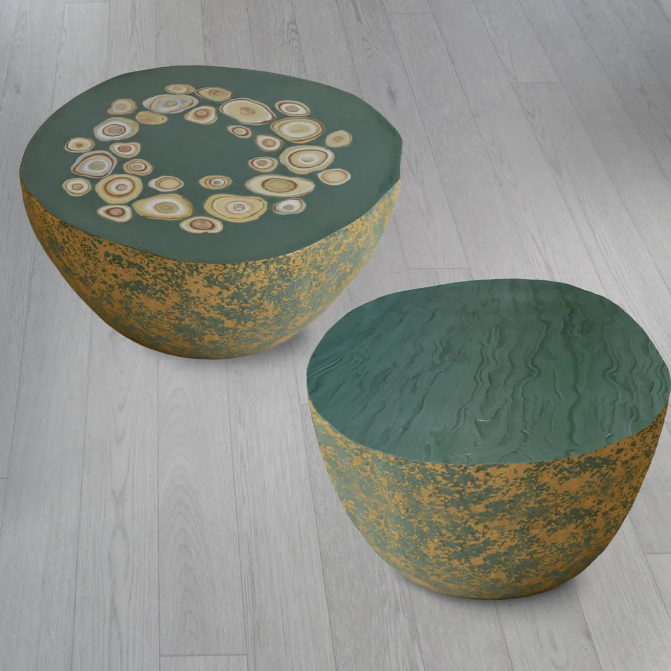 A hypnotizing dotted motif evocative of colorful murrinas trapped within precious Murano glass characterizes this coffee table from the BonBon Collection. Textural and chromatic contrasts lend it its distinctive liveliness, stated by the decorative too and coarse texture on the sides enhanced by the refined dappled gold motif. Each piece is handmade and unique.