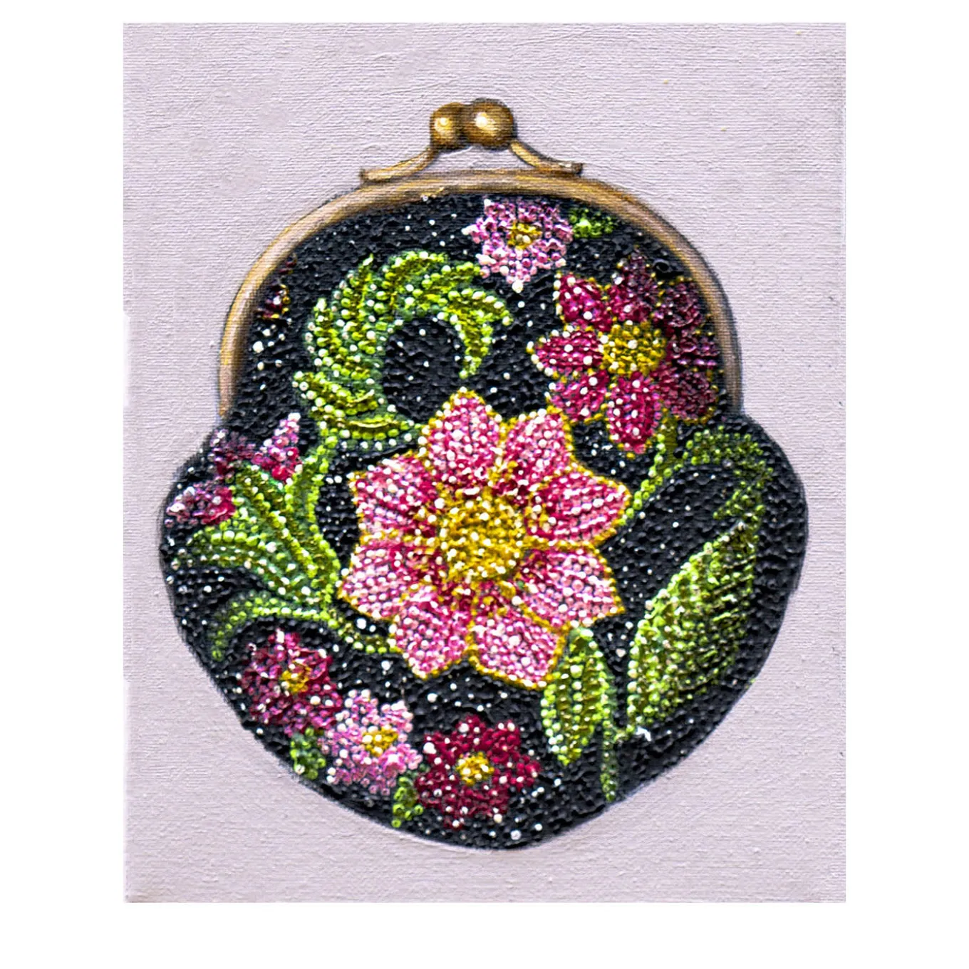 An oil on canvas painting of a coin purse adorned with intricate Murano glass beads (conterie), set against a black background. The dramatic contrast enhances the vibrant details and craftsmanship, emphasizing the elegance and timeless artistry of Venetian traditions.