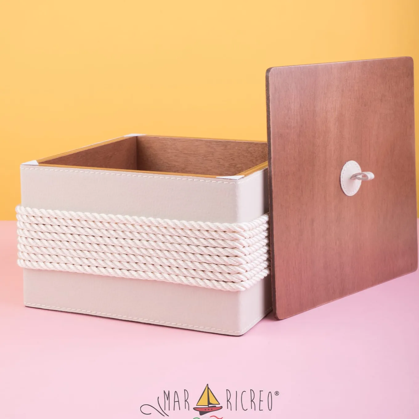 Sea as an inspiration distinguishes the designs by Marricreo and this elegant, square-cut wooden box is no exception. Equipped with a flat lid whose loop is crafted using beige eco-leather – the same used for box’s cover – it is distinguished by a series of off-white ropes adorned with a color-matching starfish for an unmistakable ode to the sea and nautical style. Please consult the Artemest catalog for more colors.