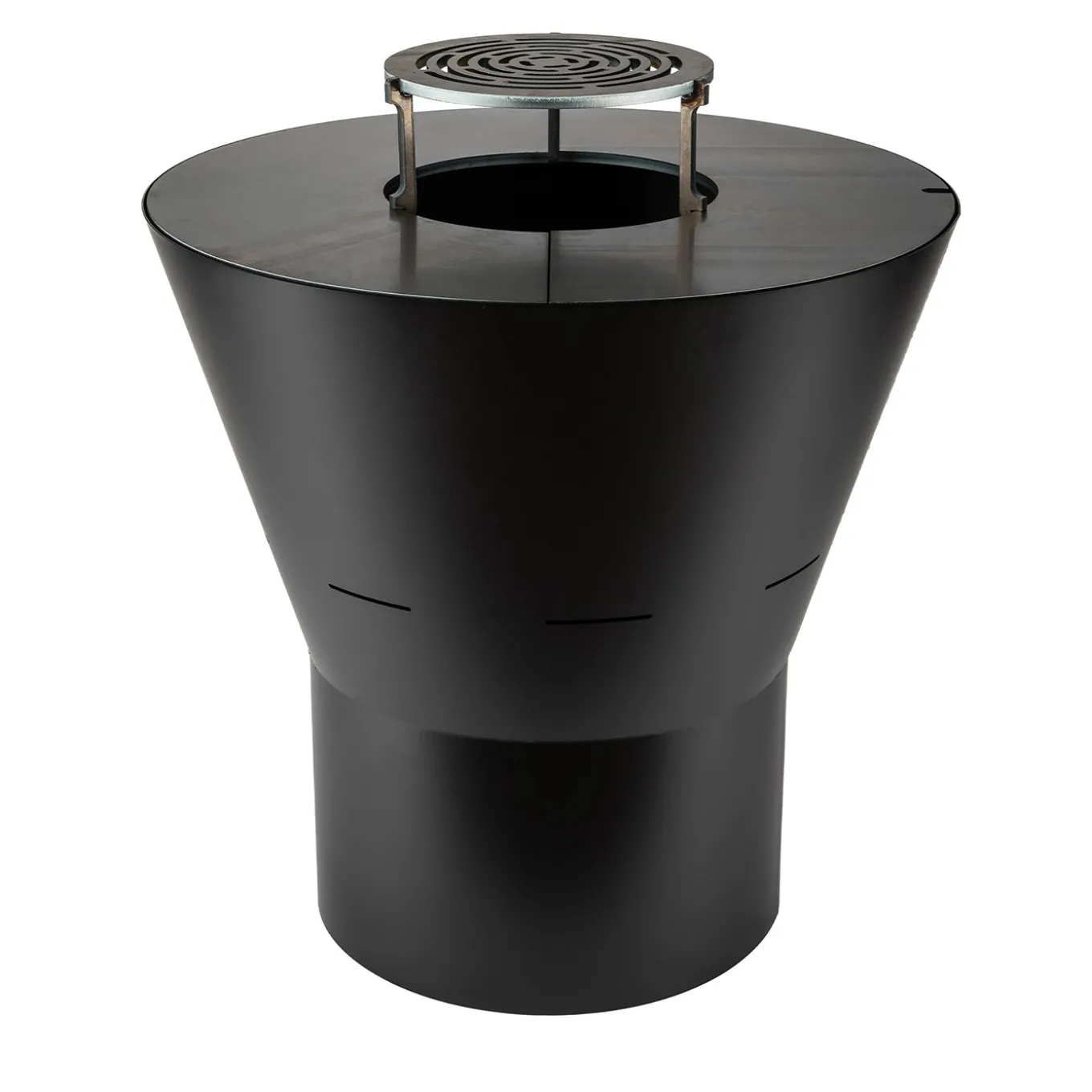 This barbecue features a modern design enhanced by its high-temperature black finish, emphasizing clean lines and contemporary style. Built to withstand outdoor elements, it retains its robust structure and appearance over time. The barbecue includes a stainless steel plate and grill, combining innovative aesthetics with practical durability, ideal for those seeking an elegant outdoor cooking solution. An exploded view of the product is available upon request.
