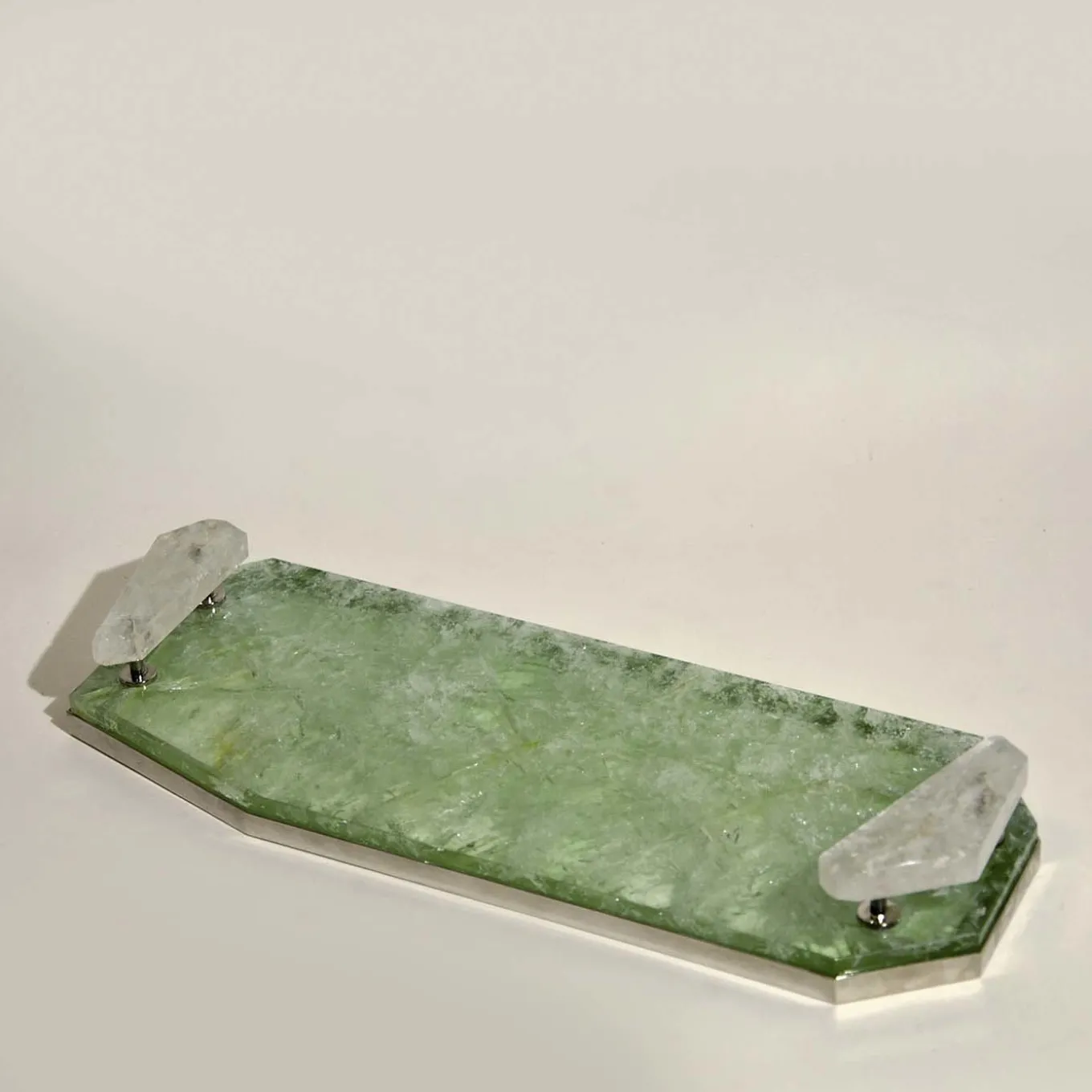 Fashioned of exquisite green quartz, this tray seemingly emerges from the rock, the jagged edges revealing expressive craftsmanship. A subtle nickel-plated brass border frames the work, highlighting the rich texture and color of the crystal. Stunning white striations complement the faceted hyaline quartz handles, adding balance and textural harmony to the work. A harmonious merging of natural stone and metal, this exceptional work of art adds understated sophistication to any decor.