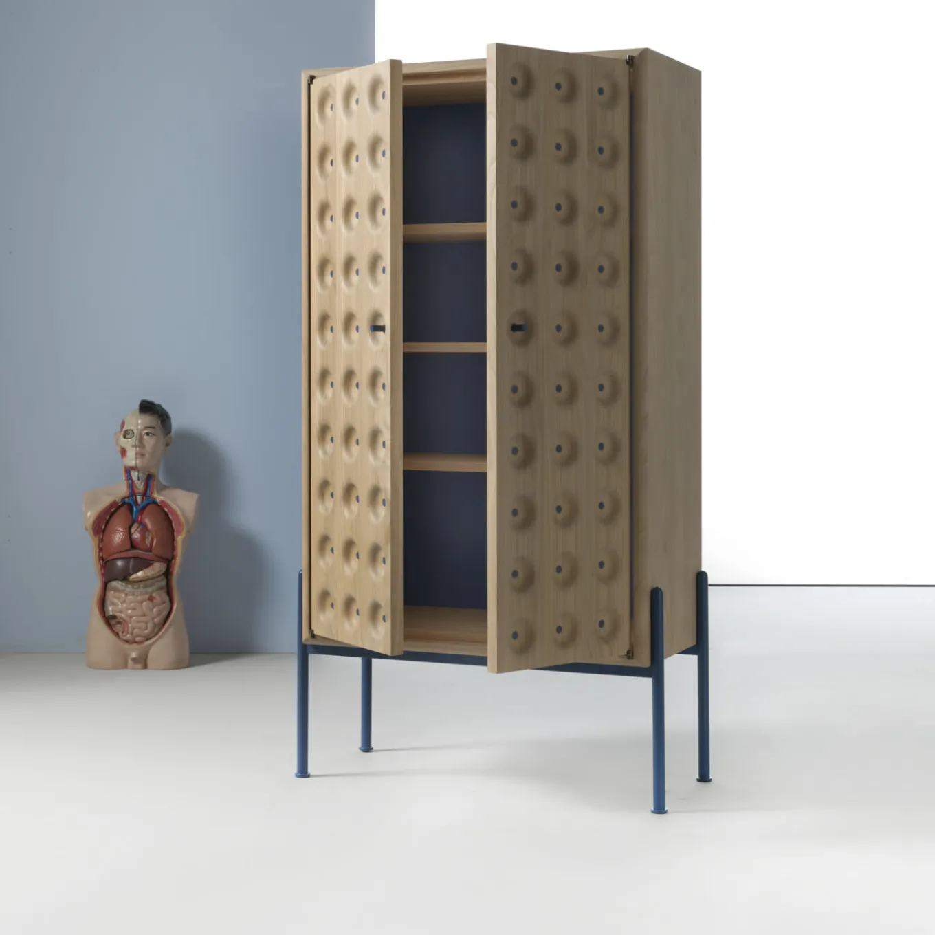 This exquisite cabinet has a skin-like surface whose texture invites a tactile experience. The minimalist legs in iron varnished in pale blue support an imposing 2-door cabinet in chestnut wood. The handles are in iron with the same pale blue finish as the legs.