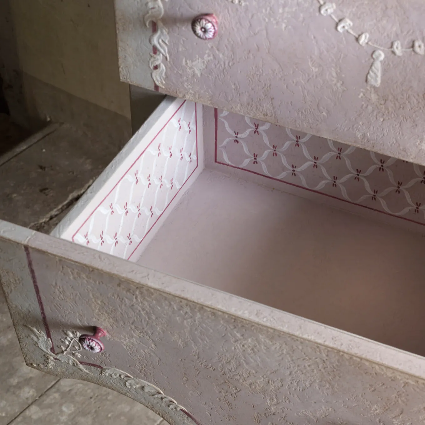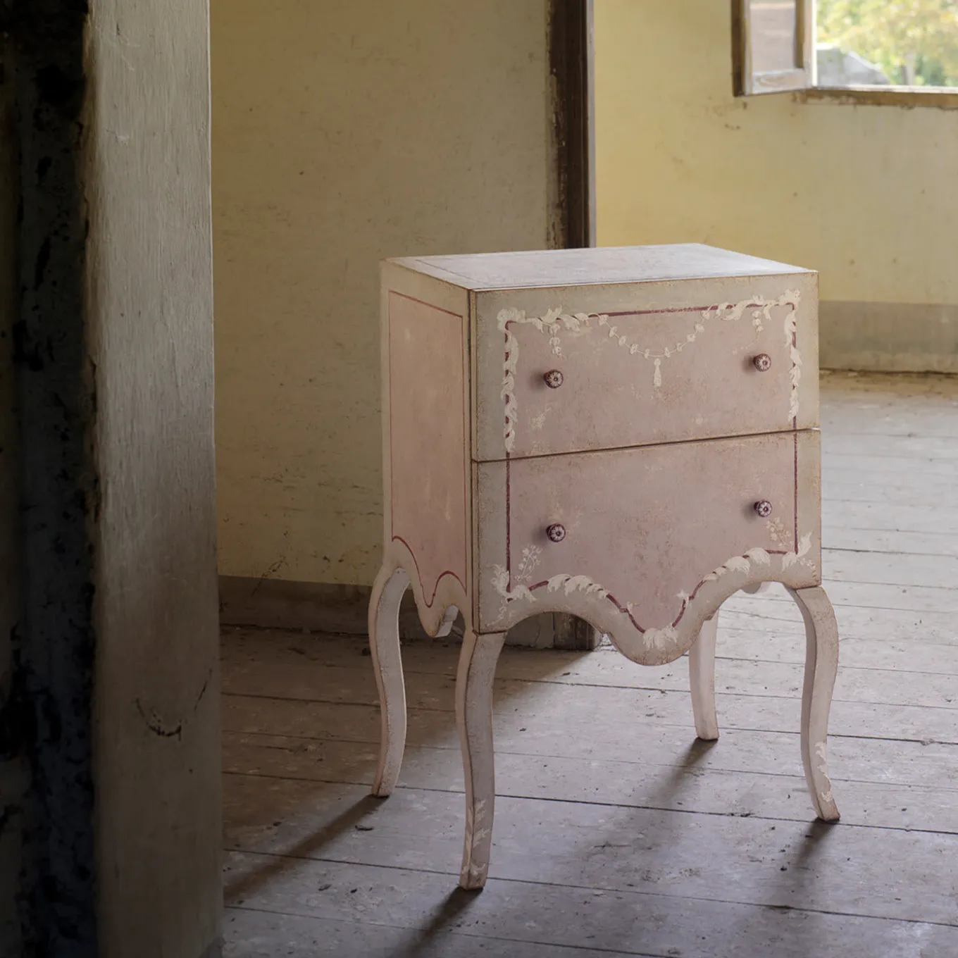 This custom-made wooden nightstand painted in pastel pink is a jewel of Venetian-style woodworking and hand-painting techniques. Marked by graceful lines, the storage unit raised on cabriole legs stands out for its wavy bottom profiles and fine fuchsia lines with white, frond motifs coiled around them. It is also possible to request an extra protective layer for the top surface. Widely customizable to meet any customer’s taste or decor needs, please contact the Concierge for customization requests.