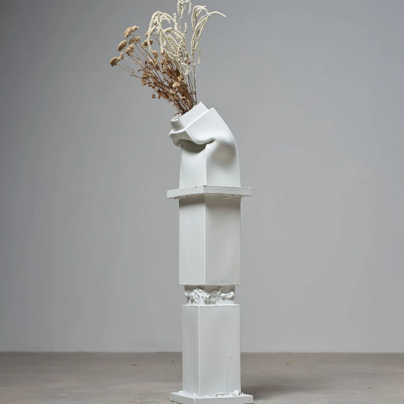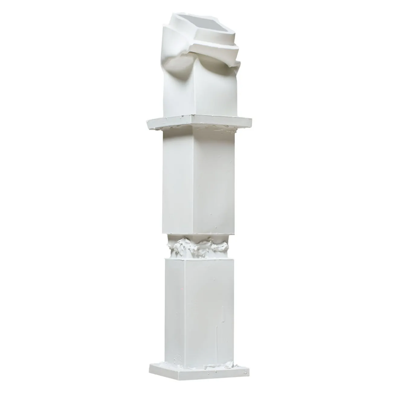 The Brenta+Brenta pedestal is a modular ceramic piece, entirely hand-built and one of a kind. A collapsed rectangular vase rests atop the structure, integrated into the design yet easily repositionable or removable. This allows the pedestal to shift in function—serving as a display surface, a side table, or a sculptural base. Both elements celebrate imperfection, tactility, and the expressive potential of hand-formed clay.