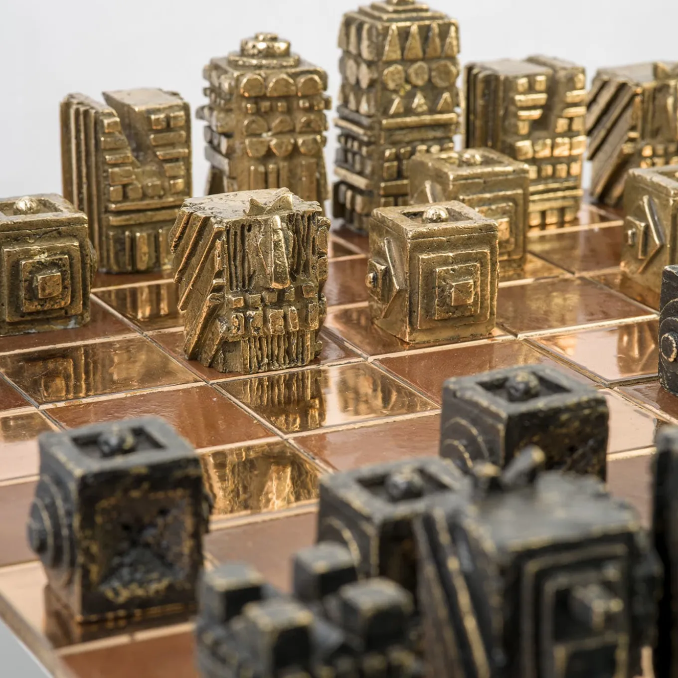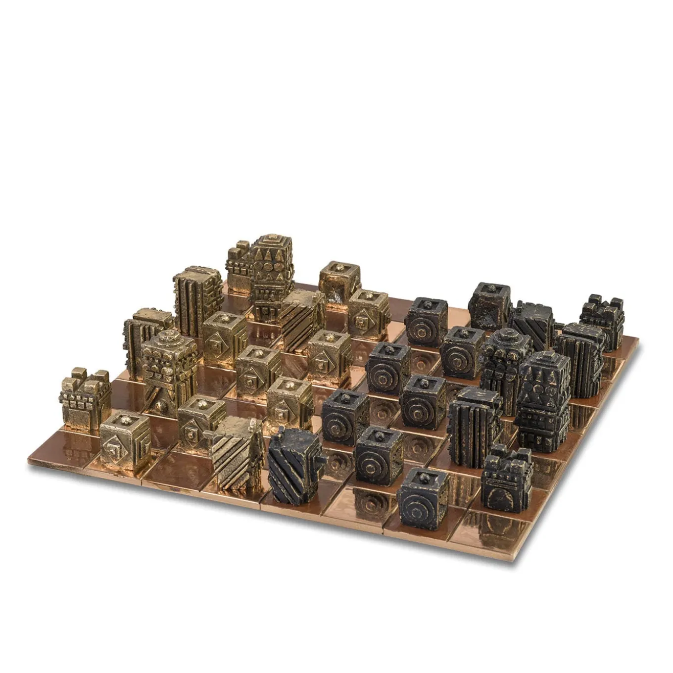 “La Scacchiera” includes 32 pieces in bronze lost wax casting, 16 polished bronze pieces and 16 black oxidized bronze pieces, and a bronze square board. This artwork was presented to the public for the first time in August 2022 during the exhibition “La Materia Narrante” in Ascona (Switzerland).