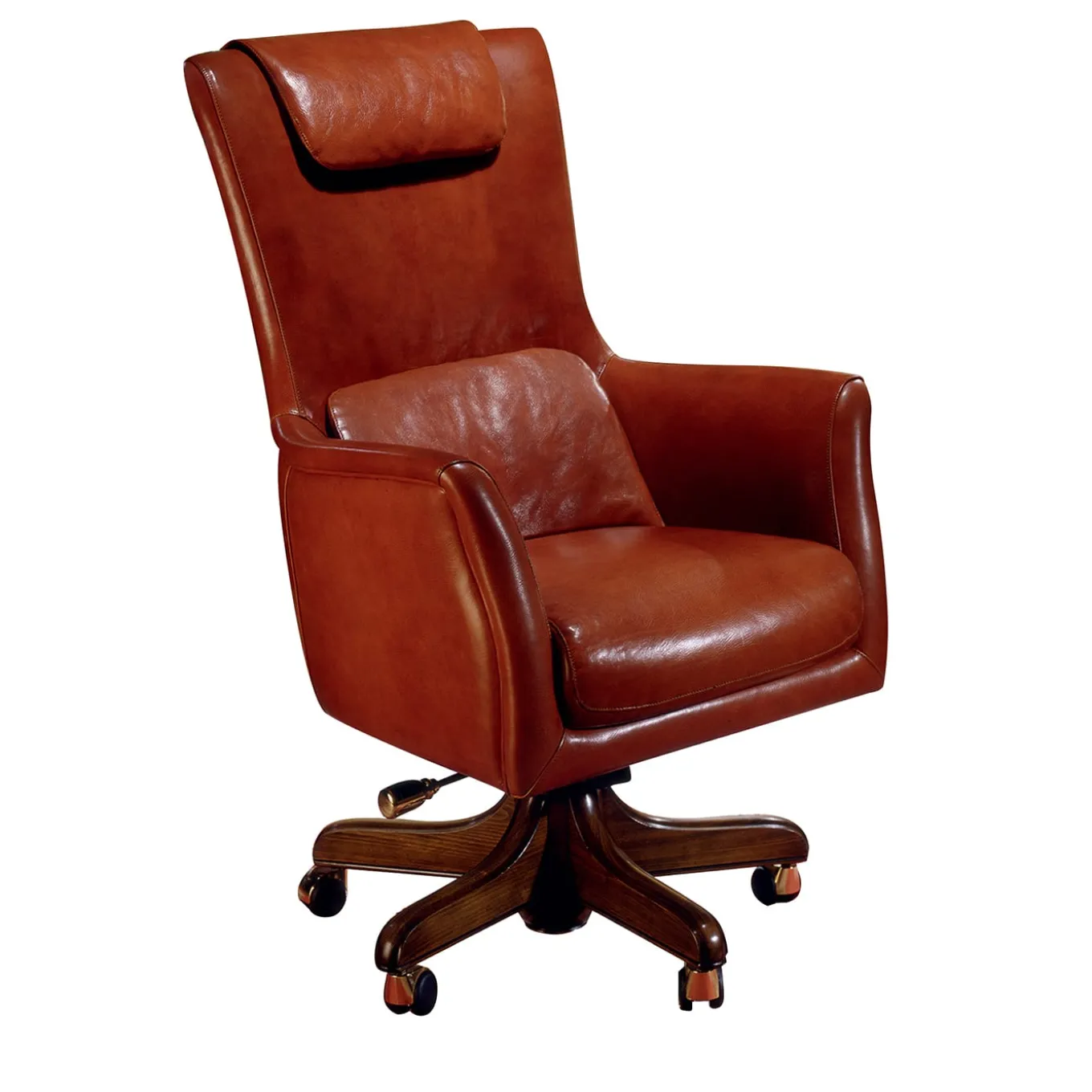Luxury Classic style swivel armchair with beech wood structure. The seat height is adjustable and the swing mechanism helps to maintain a full range of motion, balancing the posture. It is padded with webbing and superior quality foam. The upholstery particularly enhances the luxuriousness of this model and underlines the enveloping design: the leather made with a tanned bull hide reflects a reserved elegance. Other leather colours are available, please contact our Concierge.