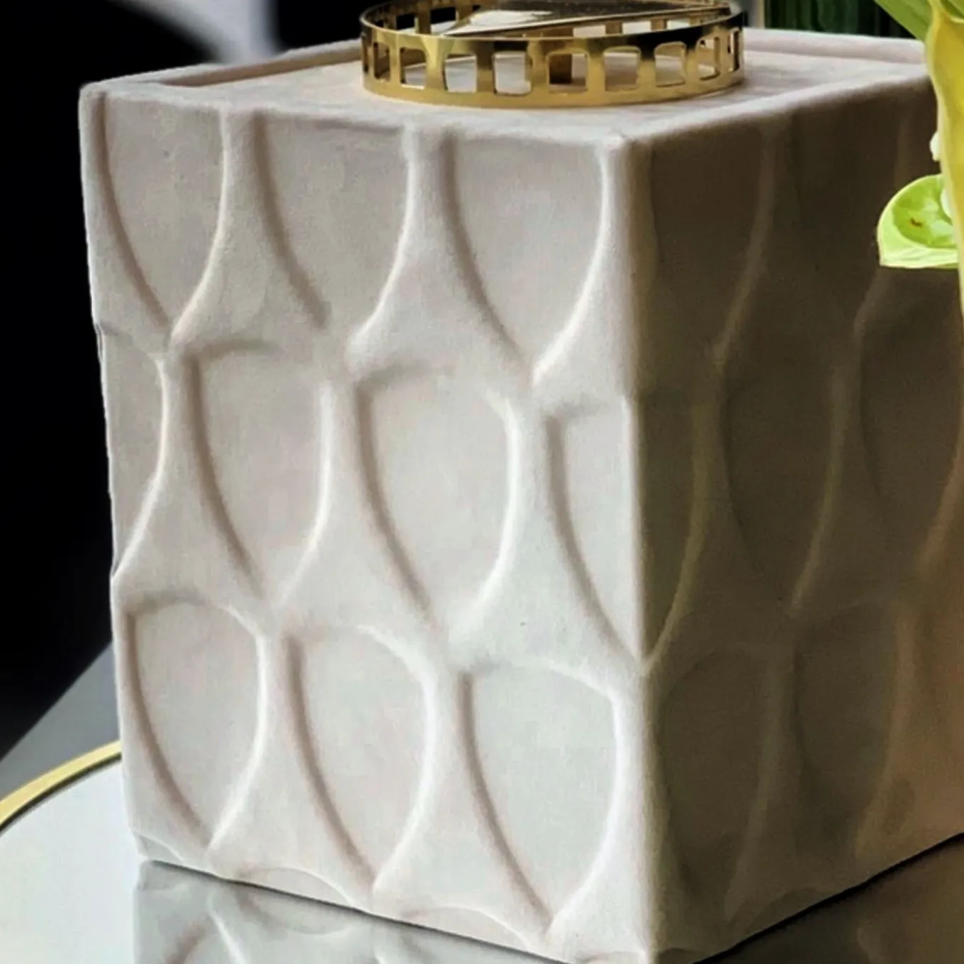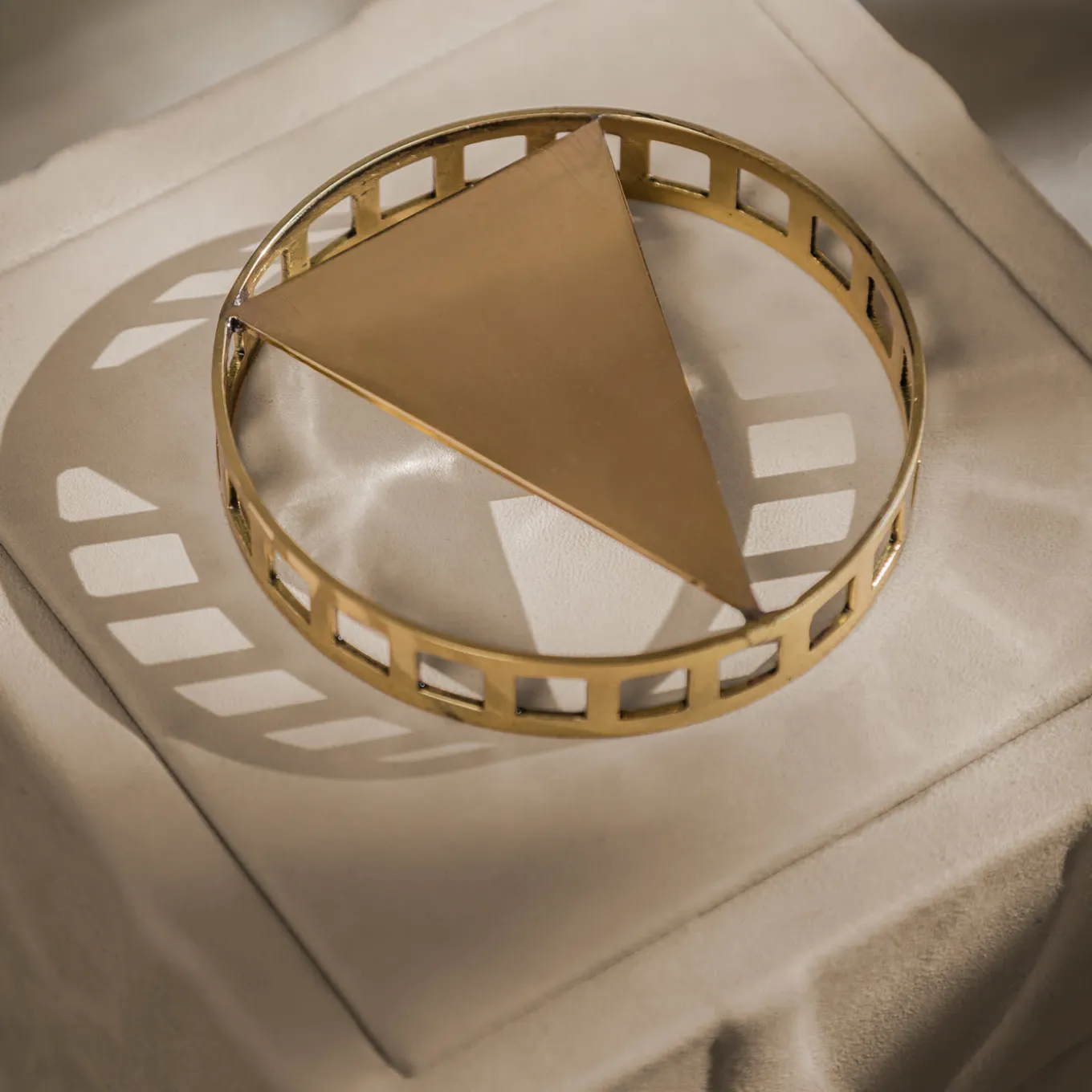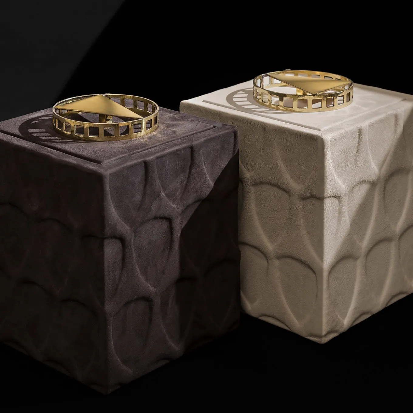 Delivering a luxurious feel with its tailored and jewel-like design, this fine box features thoughtful details homaging minimalist architectural styles. The luminous brass knob draws inspiration from the volumes of the Yale University Art Gallery by Louis Kahn, while the pure geometric volumes of the wooden structure – embellished with a tectonic, repeated texture -celebrate Brutalist architecture. Lacquered in orange, the piece is externally upholstered in prized beige Nubuck leather.