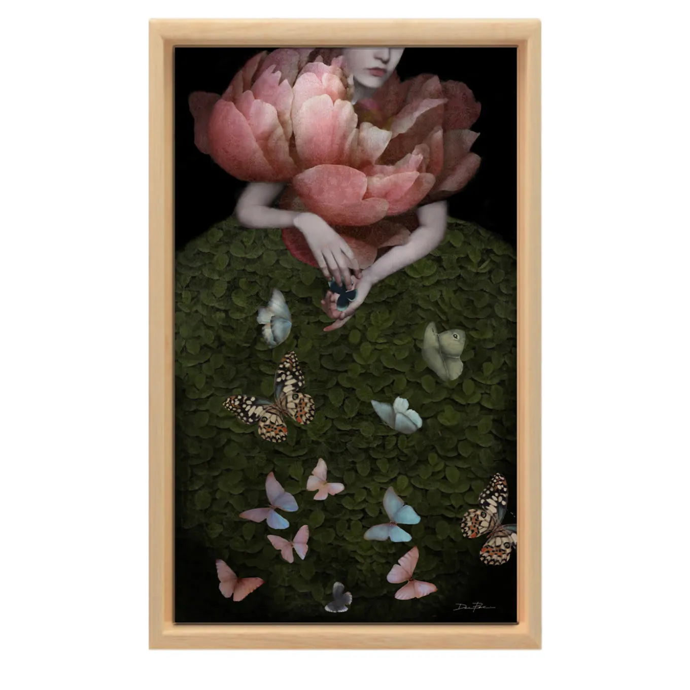 The protagonist of this Pop-Surrealist digital painting is a butterfly hunter, who catches her prey in the palms of her hands to experience the fleeting throb of its wings. She then releases it to fly free and light, like thoughts of joy. Signed, numbered Limited Edition with Certificate of Authenticity. Basswood box frame.