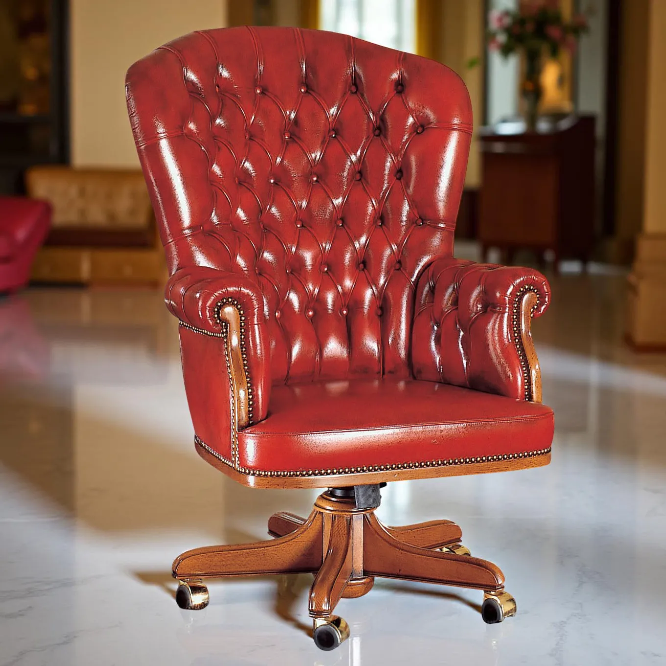Luxury Classic style swivel armchair with beech wood structure. The seat height is adjustable and the swing mechanism helps to maintain a full range of motion, balancing the posture. It is padded with webbing and superior quality foam. The deep-buttoned upholstery particularly enhances the luxuriousness of this model and underlines the enveloping design: the leather made with a tanned bull hide reflects a reserved elegance. Other leather colours are available, please contact our Concierge.