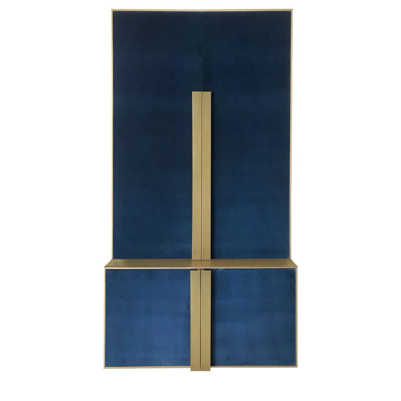 This superb cabinet will make a statement in any decor and was designed to contain bottles, glasses, plates, and table linens. Crafted by expert artisans, this piece features a structure in wood with edges in brushed brass with a golden finish that is also used for the striking elongated handles. The front and side panels are covered in a precious velvet fabric in an elegant indigo blue color. Inside, the wood has a glossy finish in the same striking color, evoking the art deco style. The top features two drawers in wood and two shelves in extra-clear glass. A back mirror enhances the splendor of the interiors.