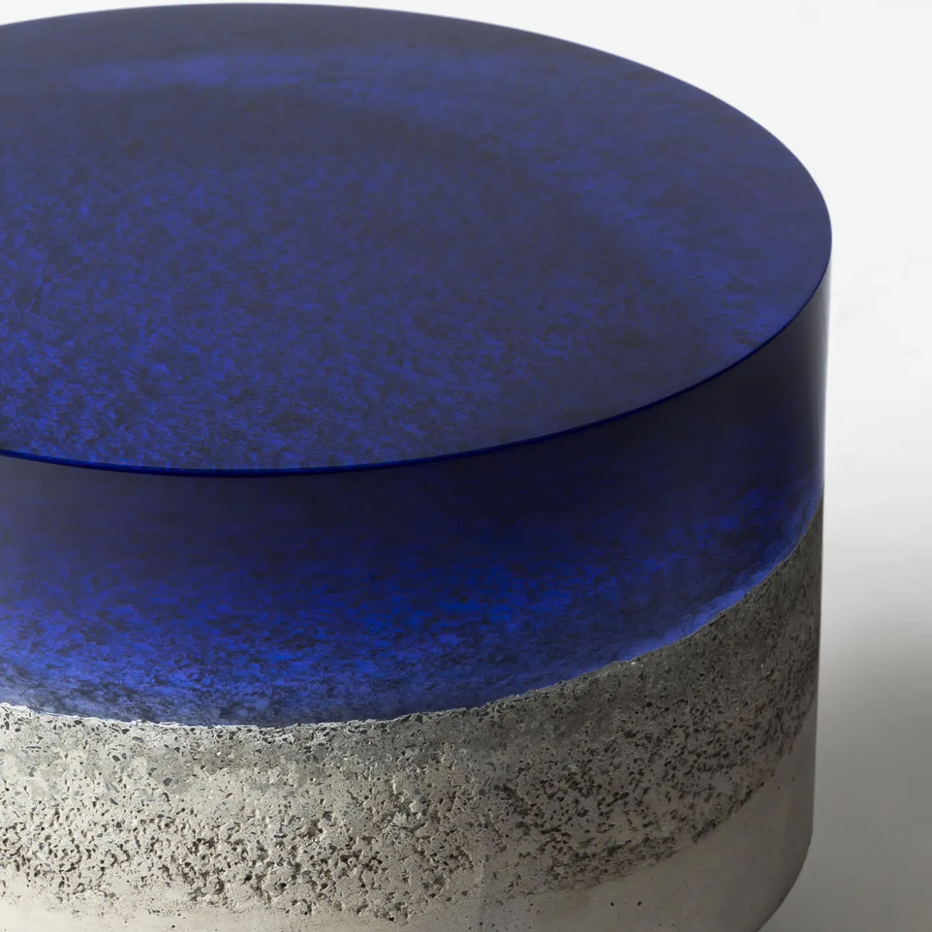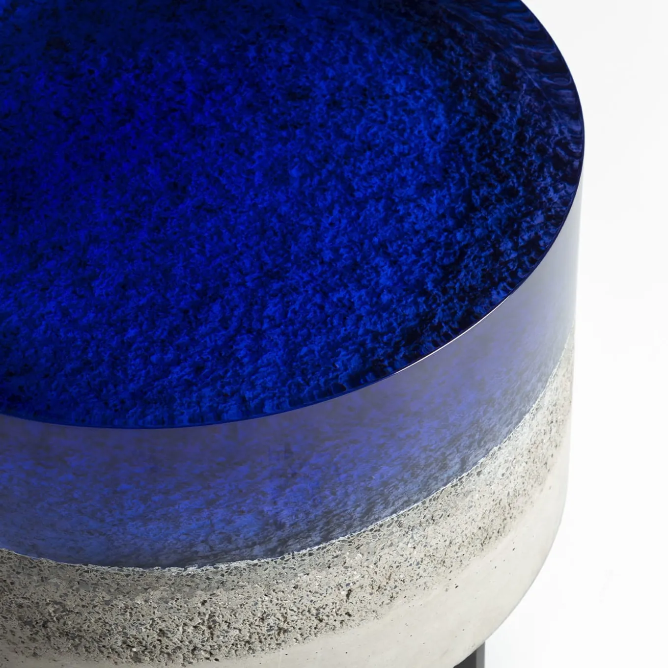 Made from a coarse concrete base covered with thick epoxy resin, Cala coffee table evokes the lacustrine landscape of Como. Resin is meticulously cast in layers to recreate a deep and shifting top, that seems to reveal the lakebed underneath. Borne by metal supports, the rounded shapes recall the smoothing action of flowing water. Available in different colors.