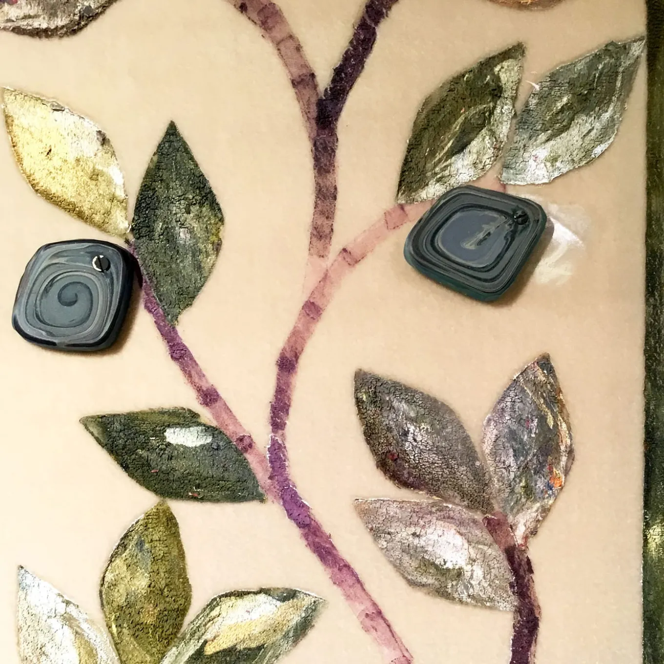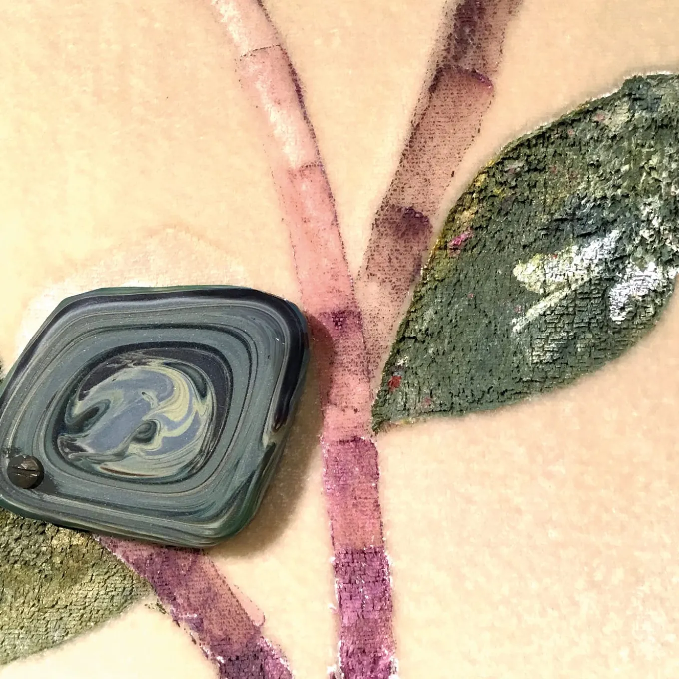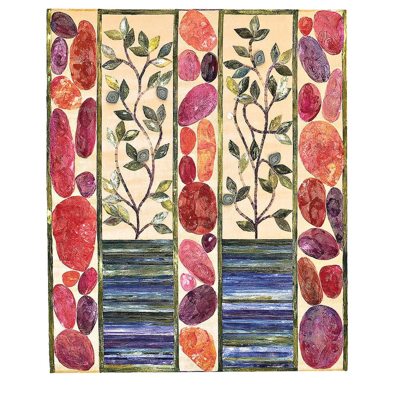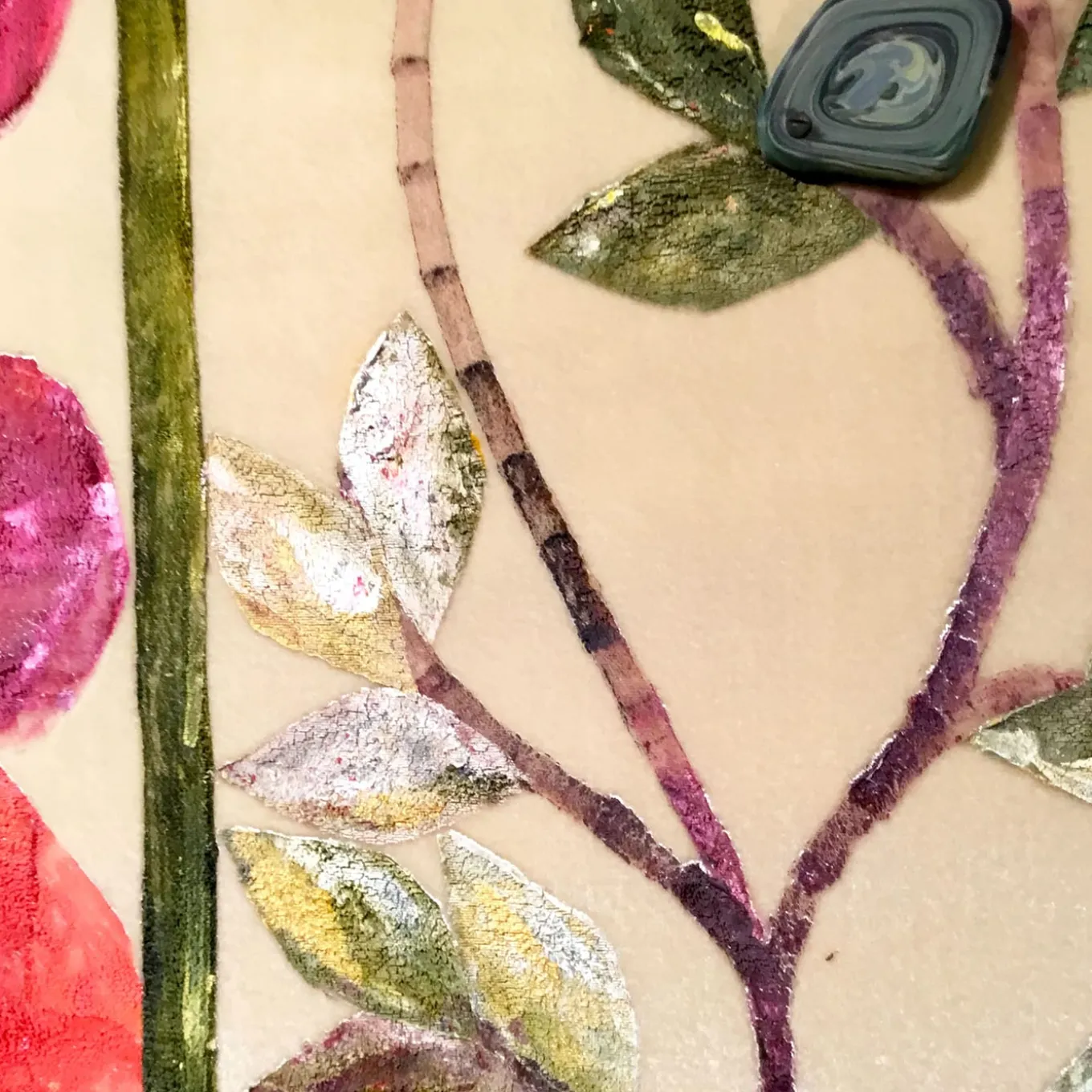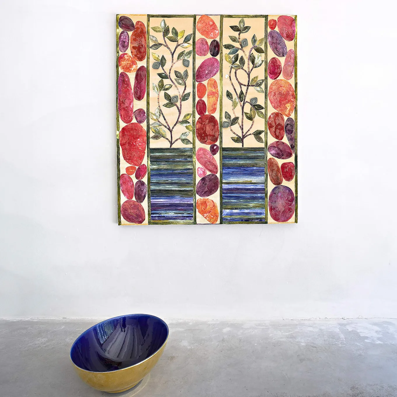 A masterful showcase of craftsmanship that celebrates Venetian tapestry and glass traditions, this exquisite tapestry is painted by hand on silk velvet, and enriched with mouth-blown chalcedony Murano glass details. Assembled on a wooden frame, it showcases a splendid depiction of natural elements such as stones, leaves, and water, obtained with natural pigments and colored pastes.
