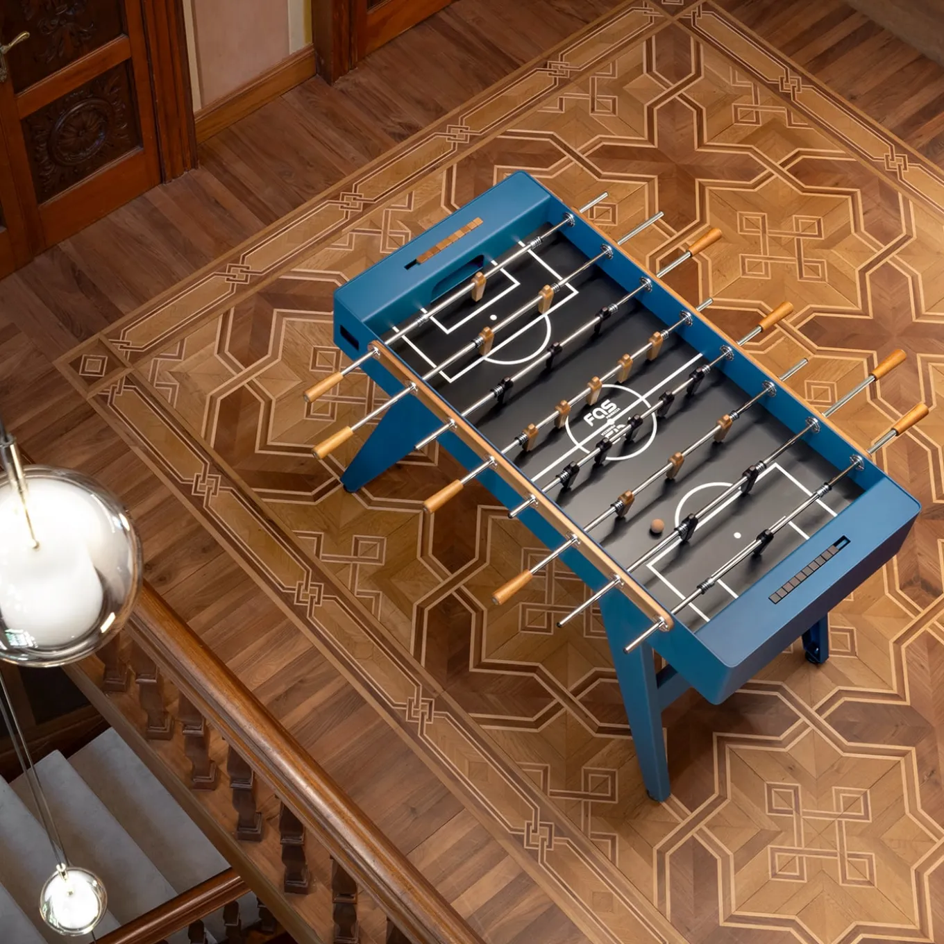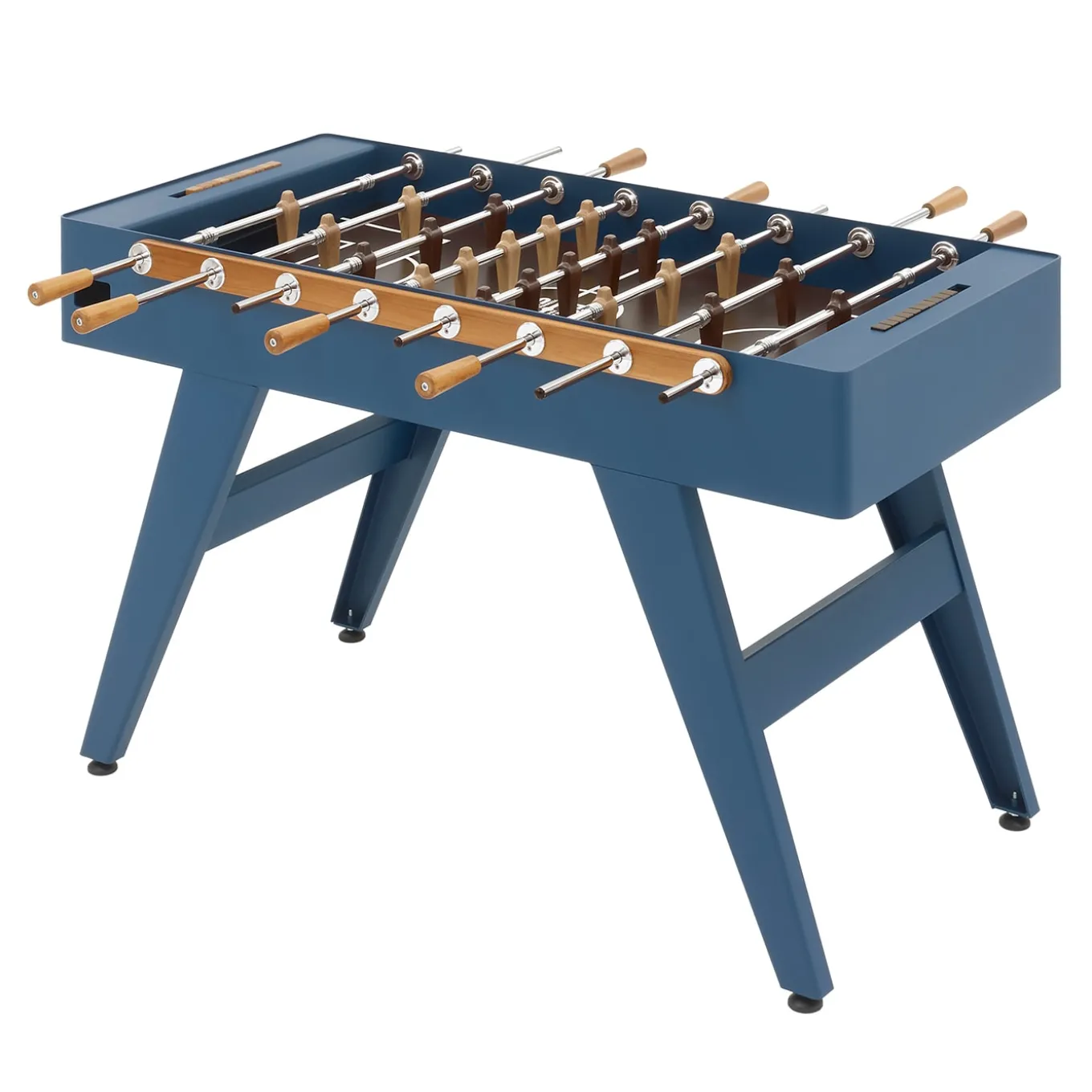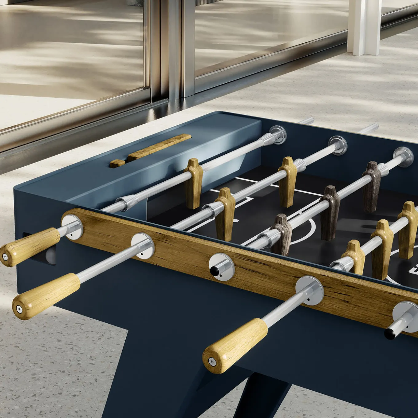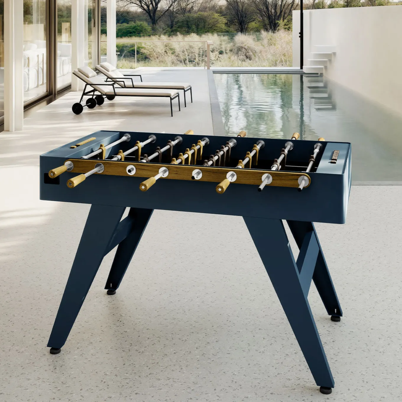 The Calciobalilla Boss Foosball Table strikes the perfect balance between aesthetics and functionality. Designed in collaboration with renowned architects, it features a sleek post-industrial style that merges the durability of metal with the natural warmth of Iroko wood in blue finish. The sophisticated black playing field is complemented by precision-crafted players and scoring mechanisms made from weather-resistant iroko wood, ensuring both elegance and longevity even in outdoor settings. The BOSS table is available in multiple color variations in the Artemest catalog and can also be customized in bespoke colors upon request. Please contact the Concierge for more information.