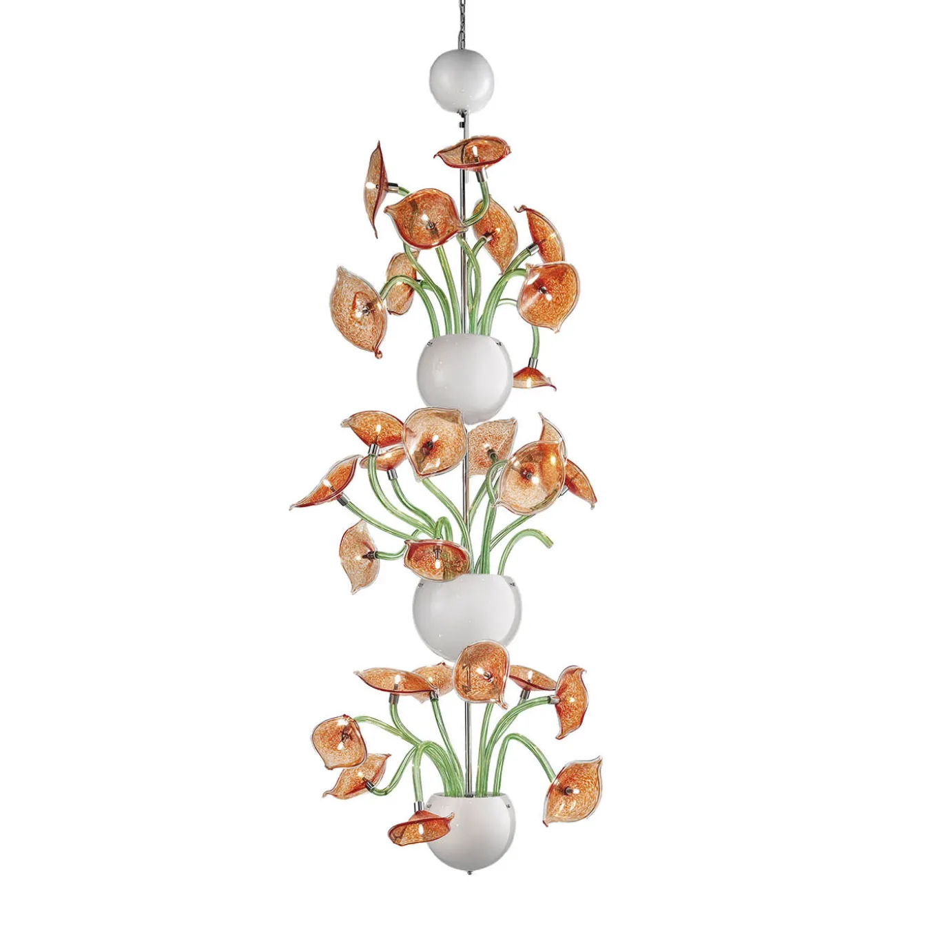 Romantic and graceful, this chandelier seduces with its phytomorphic silhouette masterfully crafted of prized polychrome glass. Sinuously extending from white globes arranged in three tiers, calla lilies with orange-specked corollas serve as poetic diffusers for the glow radiating from the G9 bulbs nestled within.