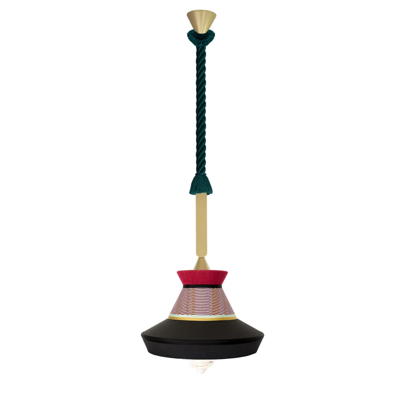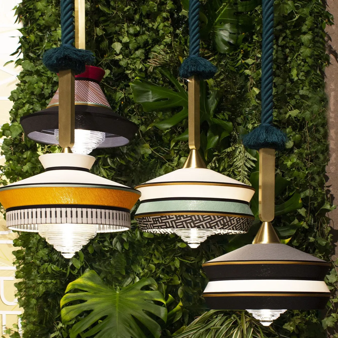 Calypso outdoor is a product with IP65 protection degree, therefore a real Outdoor. Waterproof and fireproof fabrics are suitable to withstand atmospheric agents at particularly high or low temperatures while maintaining the colors and the craftsmanship quality of the product. The electric cables pass through the green-colored marine rope and the supporting frame, which is made of a smoothed solid piece in matt gold lacquered. The light source is housed inside a glass cylinder that is sealed to guarantee the IP65 degree of protection. The diffuser is in transparent glass. Light source: 1 X E27 T8 Tubular LED bulb ip65.