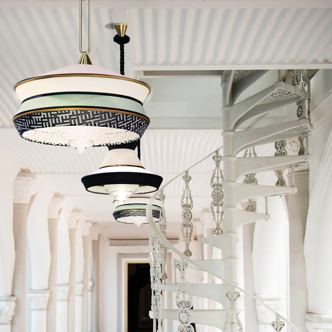 Calypso is a collection of suspensions inspired by the art deco period, with fabrics whose textures and white and black geometric patterns mix with bright colors of South American and tropical culture, providing a very original result. The indoor version is characterized by a green braided silk rope. The metal support is a satin brass finished ring. The diffuser is in transparent glass. Light source: 1 X E27 LED light bulb.