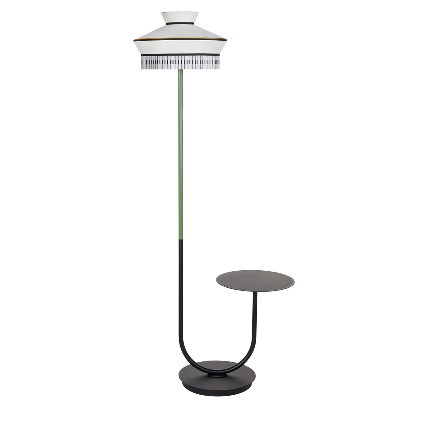 A striking and original design to enhance a contemporary outdoor space, this floor lamp is distinguished by a captivating structure completed with a practical side table. Fashioned of metal, it combines matte black and green lacquers on the linear structure. Please contact the Concierge for further information on finishes and materials.
