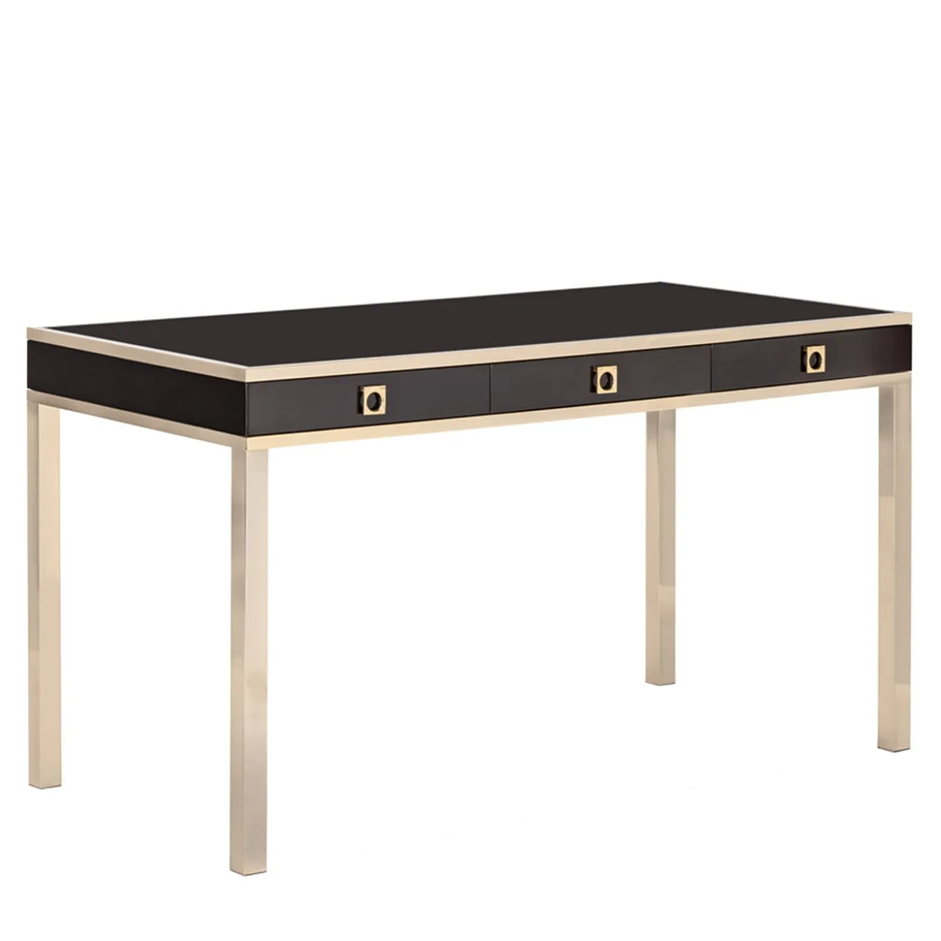 Writing desk with Art Déco inspiration. The rigorous lines of Camilla mix glossy natural brass legs with black maple top to achieve a look marked by timeless elegance. It is available in different finishes. Please contact the Concierge for other information.