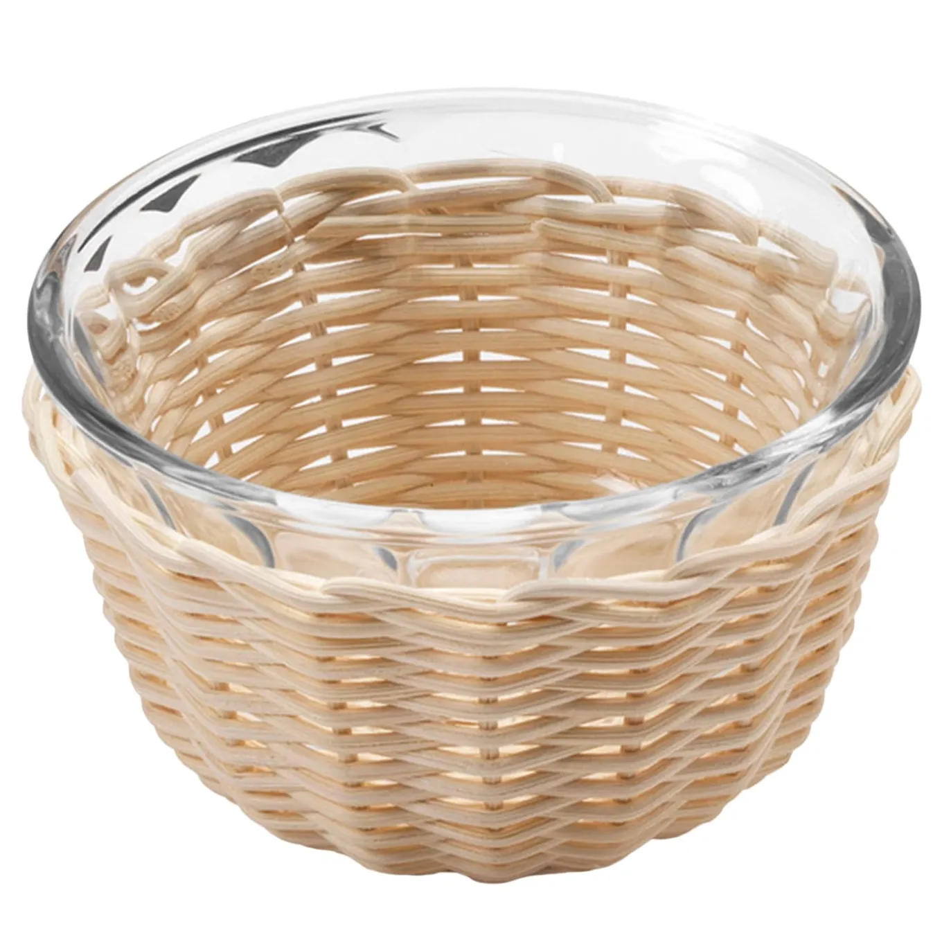 An exquisite design of timeless value and contemporary style, this bowl combines the sleek and polished flair of pyrex glass with the raw and textured character of wicker. Masterfully woven by hand, it can be used to serve ice cream or fruit salads at the end of an elegant dinner. Finished with clear water-based paint. Please consult the Concierge for further details.