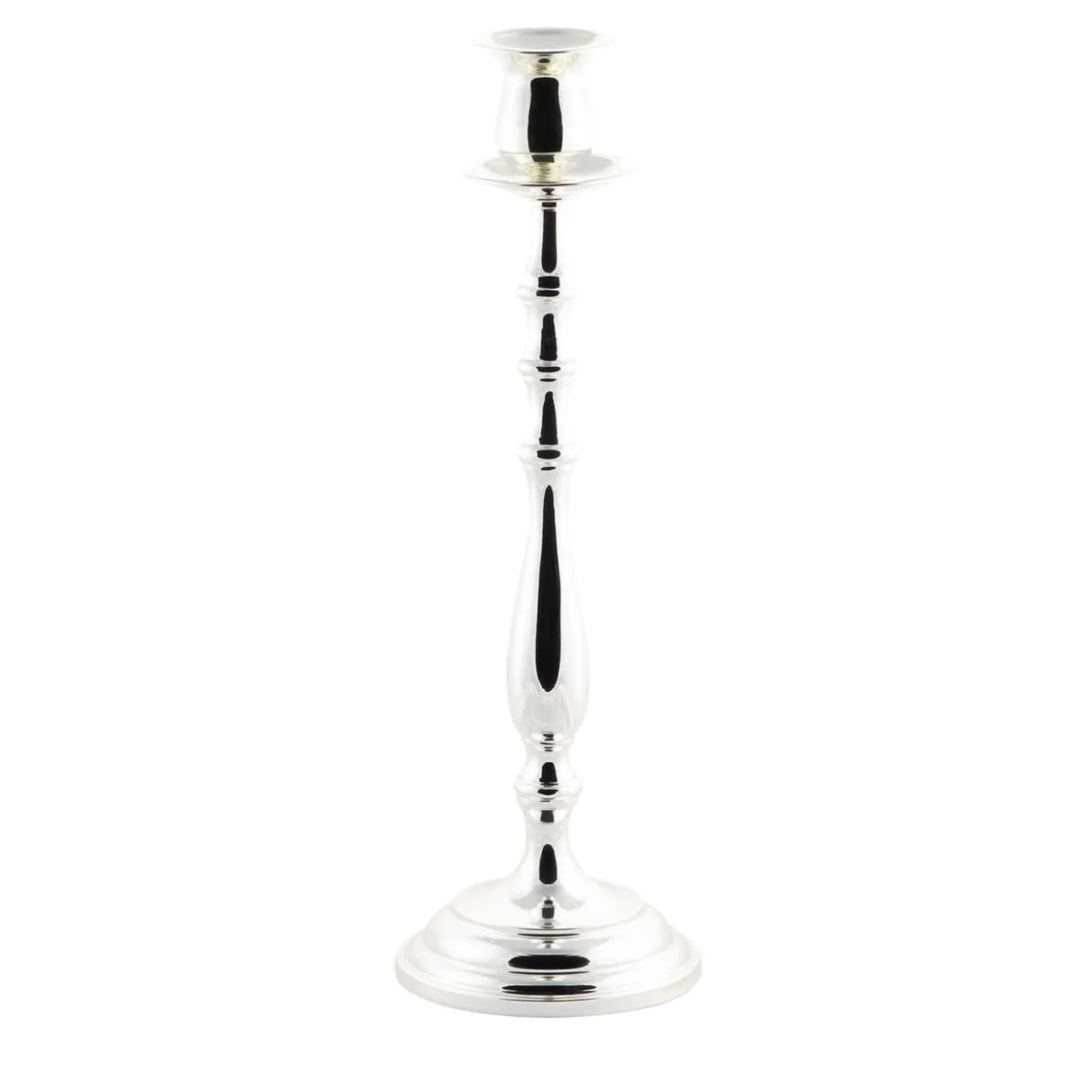 Elegant in its simplicity, this candle holder is a testament to traditional craftsmanship. The Sheffield-inspired silhouette is silver-plated and boasts a tiered round base with an undulated stem ending with a spherical holder. Used as a standalone centerpiece or showcased in multiples on an entryway console or dining table during formal family dinners, this piece will be the focal point and a sophisticated ambiance.