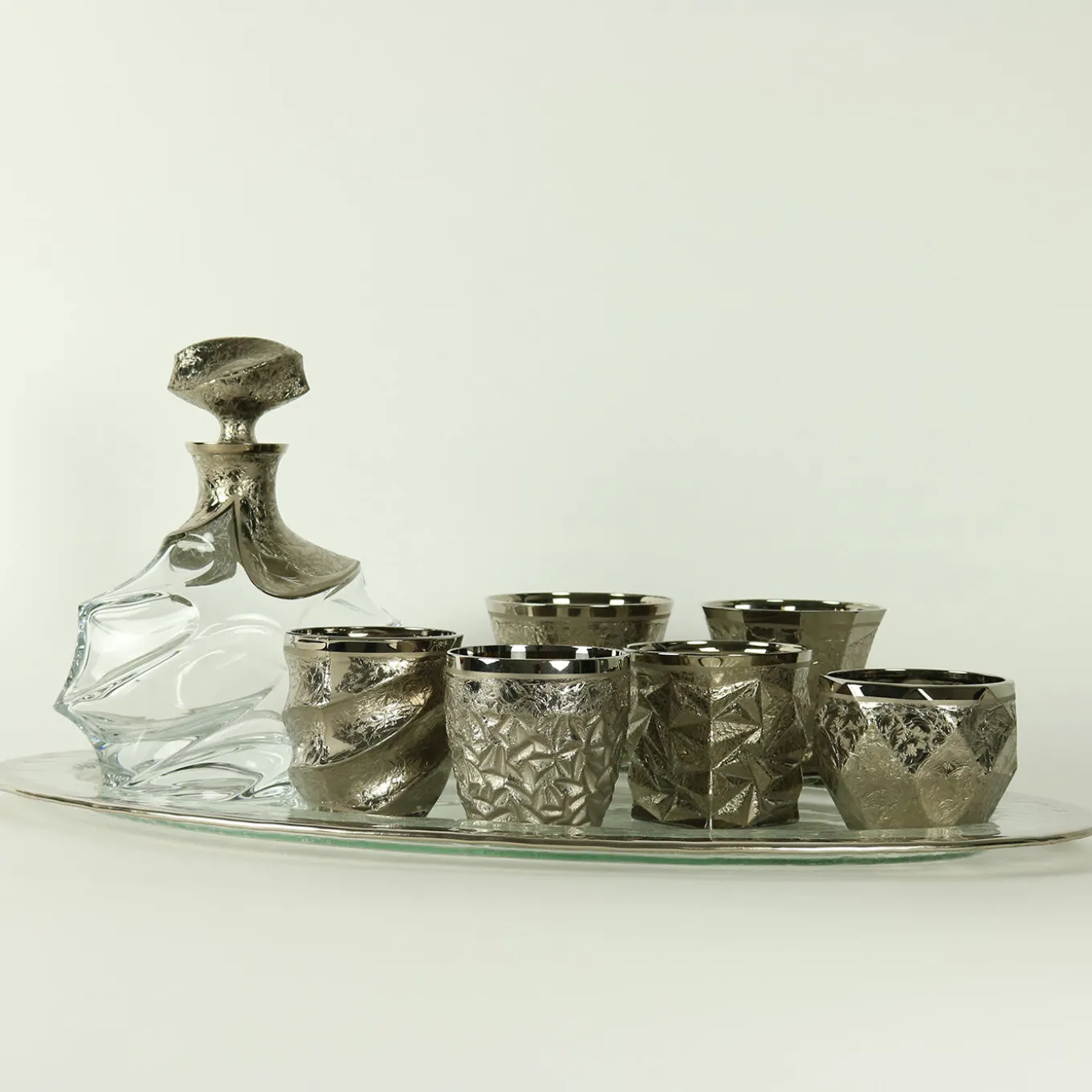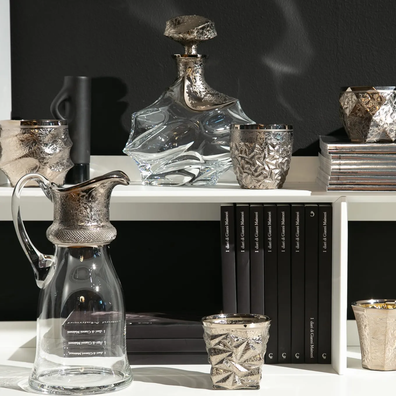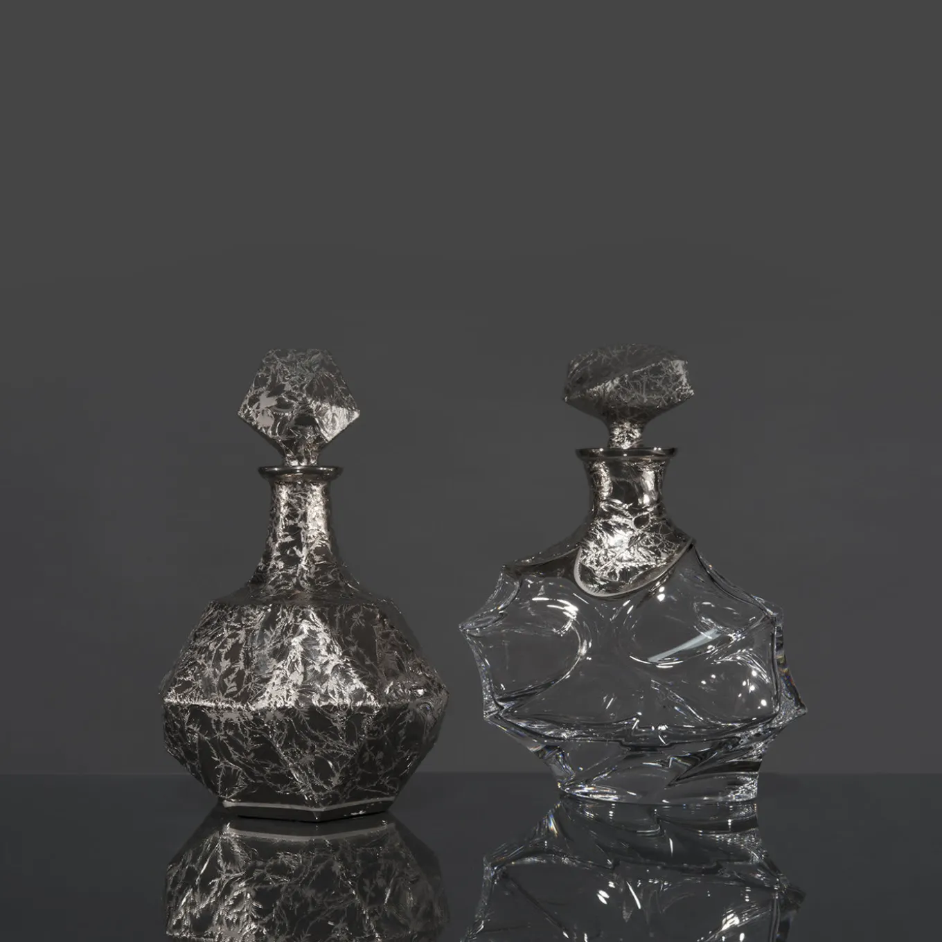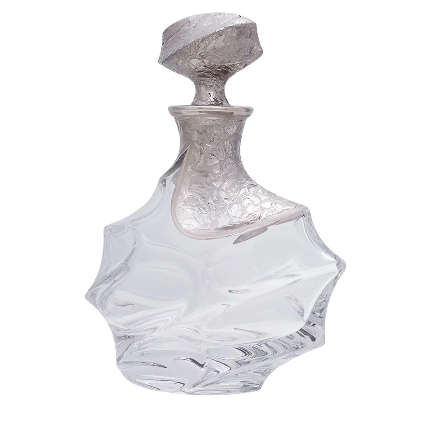 This exquisite bottle that can be used to store and serve whiskey and liqueurs and will add a touch of luxury to any home. Its body is entirely made in crystal that was carved into solid glass obtaining wave-like textures that add a dynamic and modern effect to their surface, while the top and lid are graced with platinum.