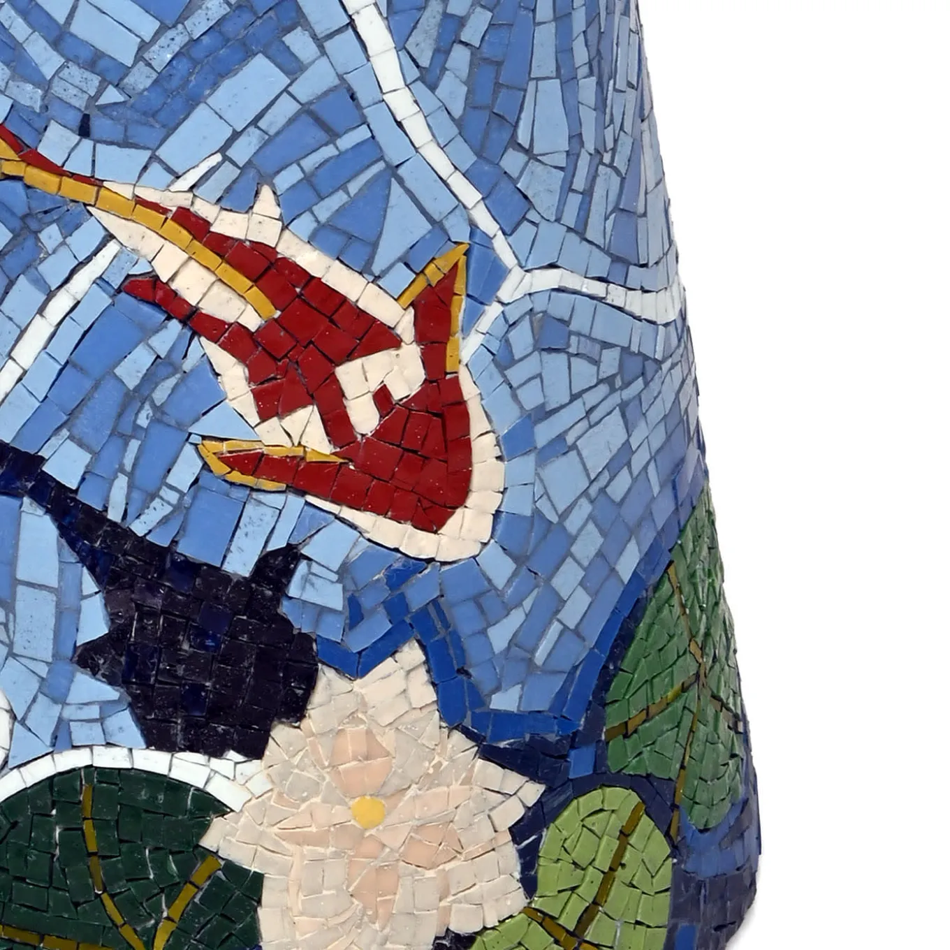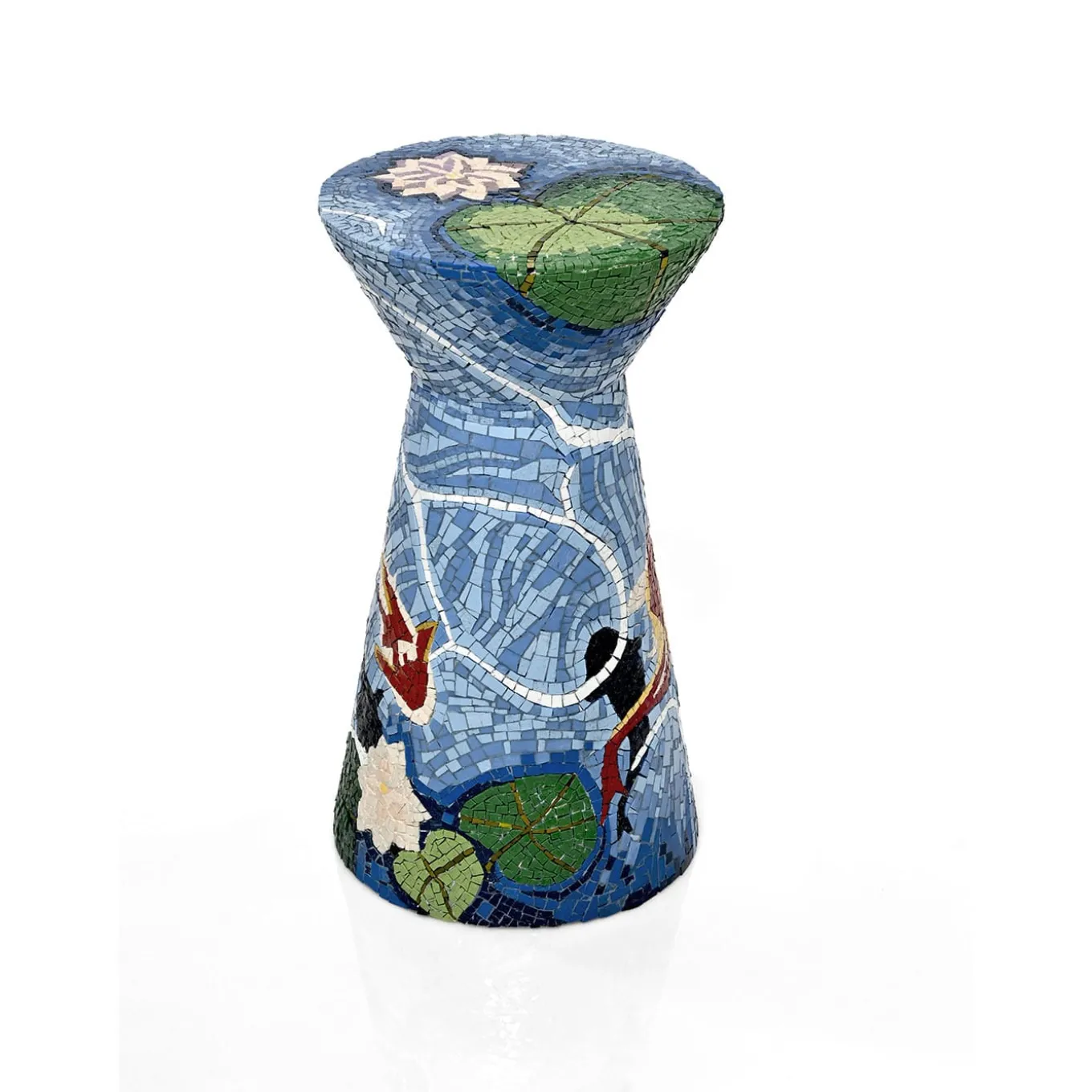 More than 4.000 mosaics have been cut and assembled one by one by the expert hands of Michela Nardin, using 10 different shades of colors for 65 hours. The KOI Carp enjoyed their moment in the Venetian Lagoon, magically crystallized into glass mosaics of blue waters and Loto flowers. This piece is unique.