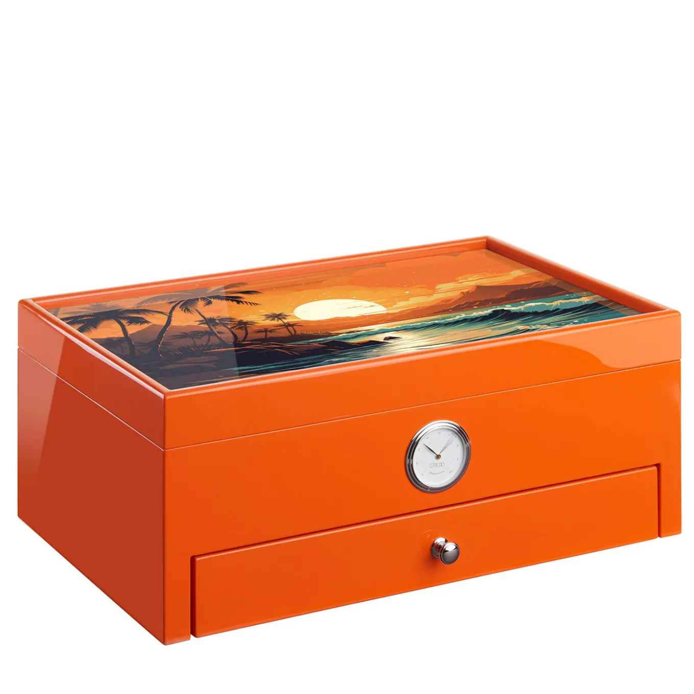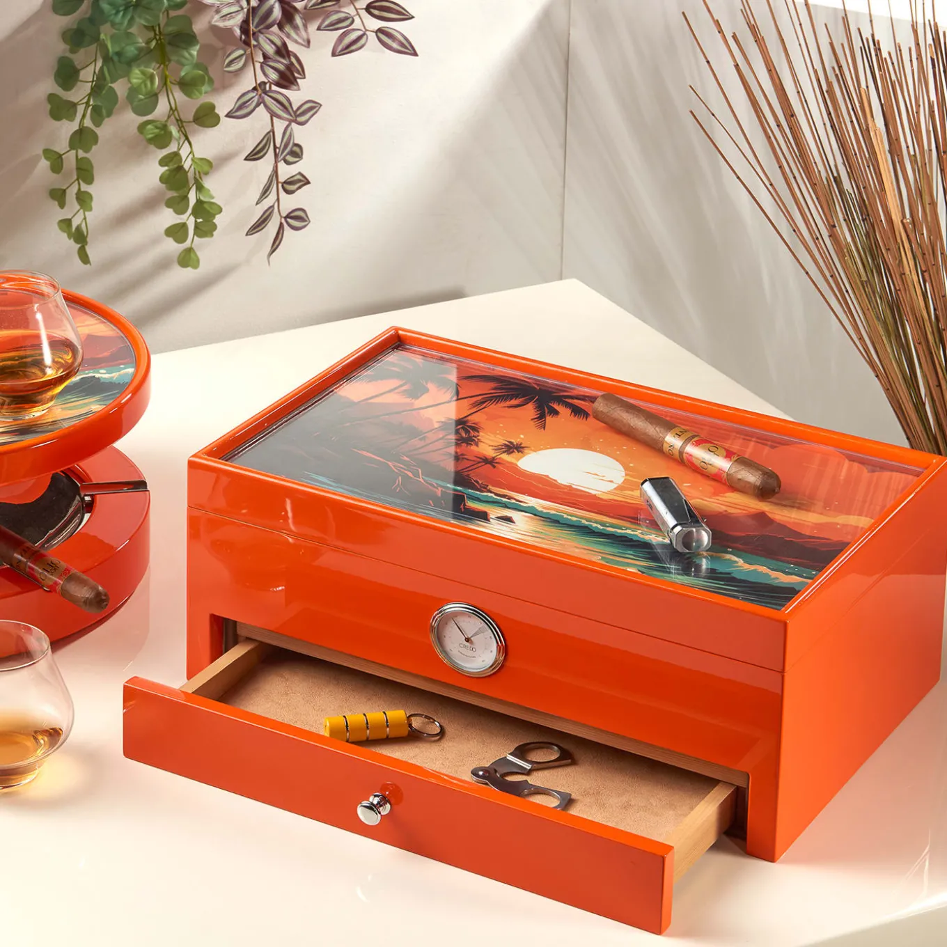 Crafted from varnished wood with an extra glossy finish and a captivating printed glass panel, this Caribbean-inspired humidor maintains optimal humidity with its cedar wood lining. Featuring a cedar-lined drawer with a removable Alcantara insert, it offers versatile storage also for other smoking accessories. With two removable cedar wood separators and an analog hygrometer, it can hold up to 100 cigars.