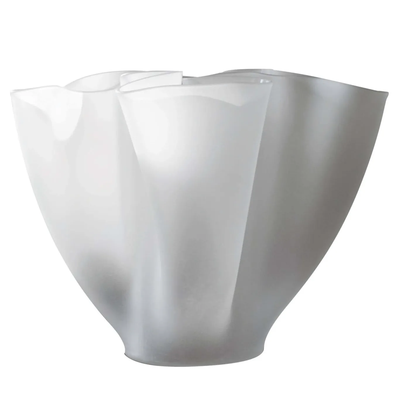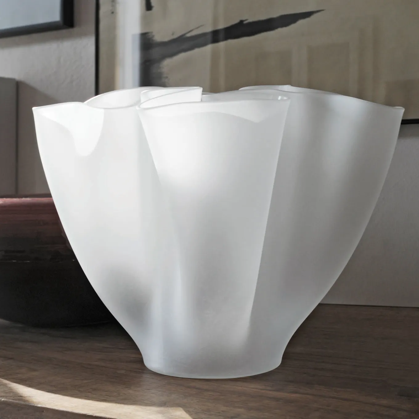 Playfully evoking the shape of a wrinkled paper bag, this vase was designed by master glassmaker Pietro Chiesa in 1932, when he was the co-artistic director of FontanaArte with Gio Ponti. The shape is obtained by folding the white glass when hot and is available also in blue. Due to its handmade construction, every piece is a unique work of art.