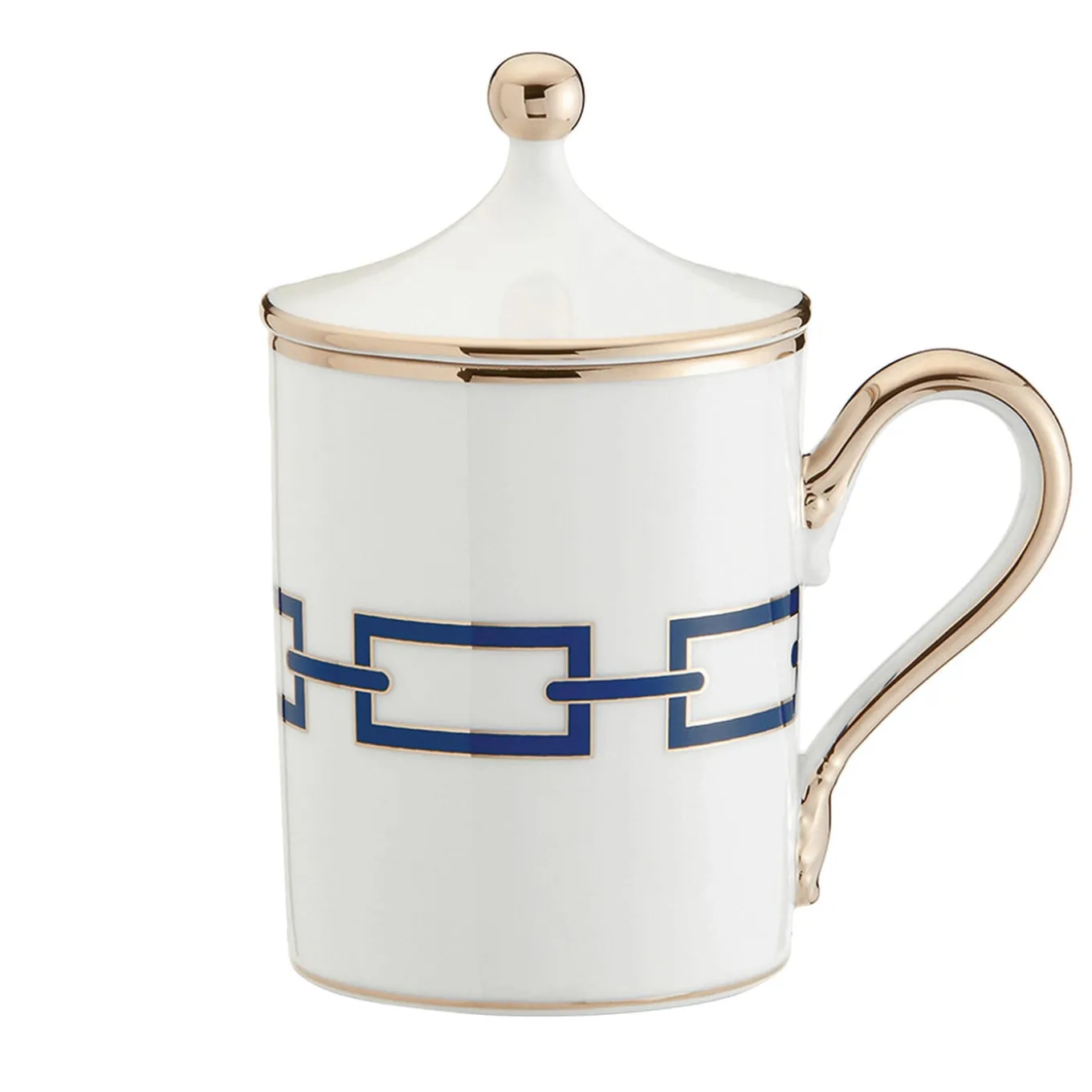 This mug with lid (cc 400) is an elegant way to enrich an everyday ritual with exquisite allure and a unique design. Part of the Catene Collection, designed in 1926 by iconic designer Gio Ponti, this superb mug is crafted of fine porcelain and decorated with a geometric chain-like decoration in sapphire blue. Gold accents highlight its silhouette, the lid and the handle.