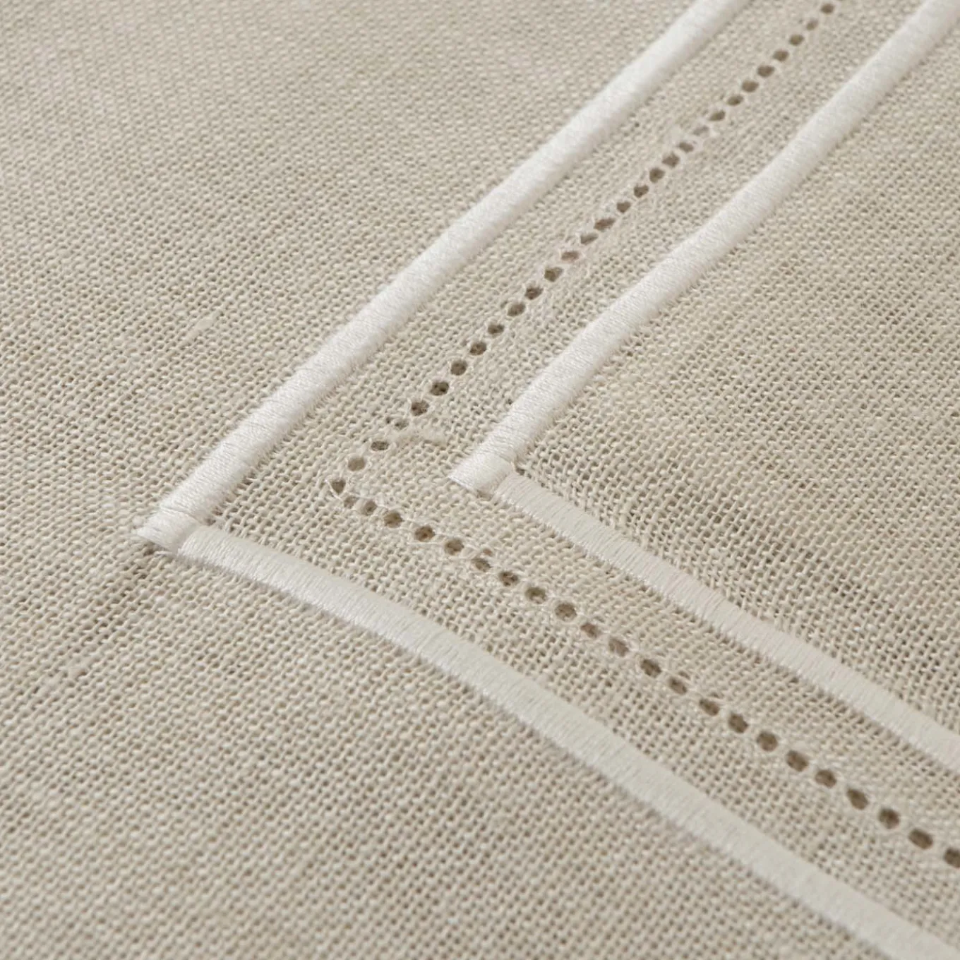 A simple linen tablecloth is elevated to a refined decorative accent by the delicate stitch detailing running along its border. Made of linen in a natural ecru color, it features two white double thread stitch details running parallel to frame a delicate hemstitch in between. Entirely handmade using ancient techniques, this polished tablecloth can be overlaid creating tone-on-tone effects or used by itself for a minimalist, chic look. Please ask the concierge for available sizes and pricing in these options.