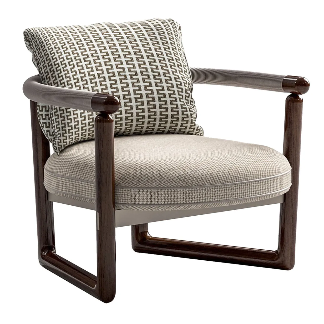 The Cecil armchair features a robust glossy sapeli mahogany frame enhanced by armrests bordered with leather. It combines durability with comfort, upholstered in a subtly patterned fabric that complement its elegant design. The chair’s balanced proportions and refined detailing make it suitable for sophisticated outdoor settings, providing both style and relaxation in medium size. Also available in painted iroko finish and leather upholstery; for further information please contact the concierge.