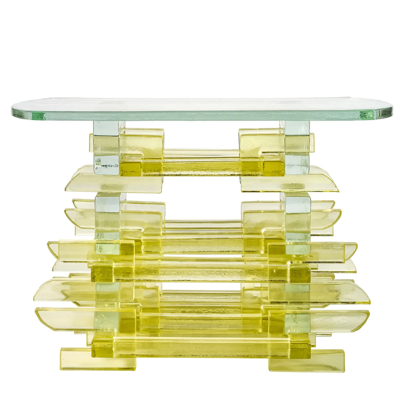The Chain side table features a unique construction of interlocking cast glass components, inspired by traditional Asian joinery and temple architecture. The design incorporates multiple donut-shaped bricks cut and threaded through each other, creating a sculptural and detailed base in light amber topped with a textured crystal glass surface. This numbered edition highlights the intricate craftsmanship and interplay between form and transparency.